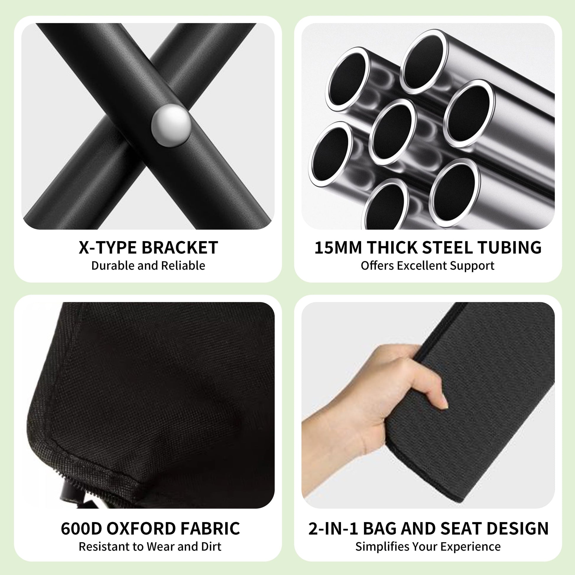 - STRONG & STABLE SUPPORT UP TO 220 LBS: Built with a durable steel frame and cross-braced legs, each stool supports up to 220 pounds. The tear-resistant seat fabric ensures long-lasting comfort and reliability on various terrains.