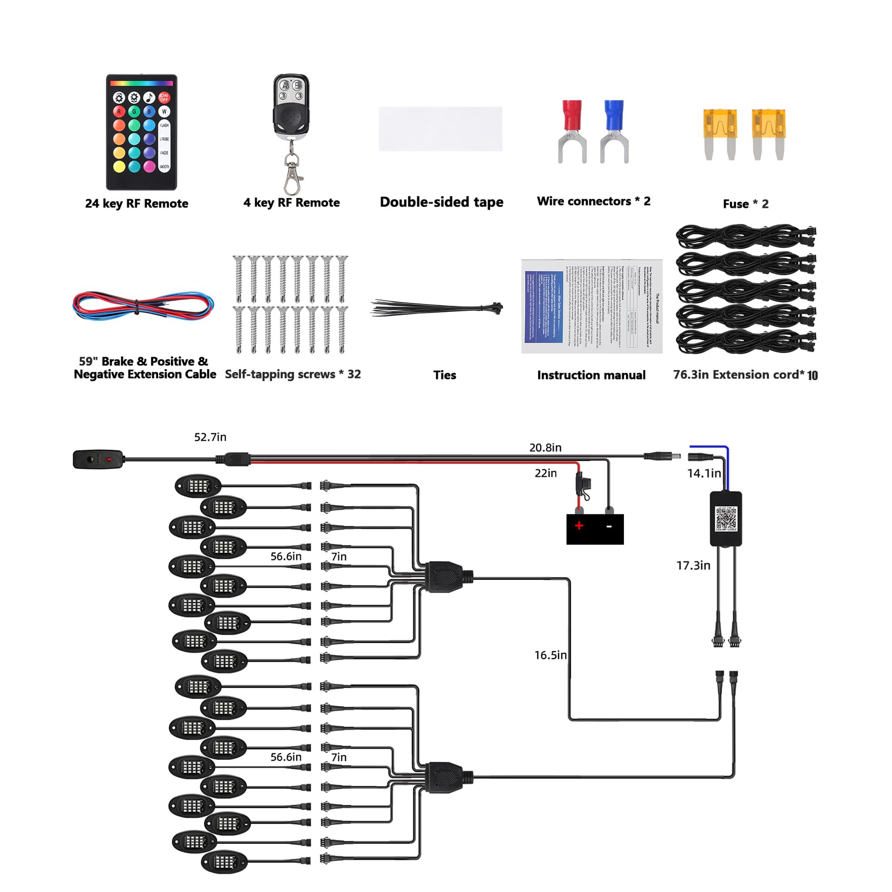 - DUAL ZONE CONTROL BY APP AND RF: The car underglow LED lights are equipped with 4 in 1 connect, which can set the combination and arrangement of colors on both sides separately for RGB led rock lights by 2 RF Remote. You can control the LED rock light kit with an App and RF remote controller, adjusting the dimness, brightness, sync mode, and light flash mode to fit the mood. The kit also comes with 2 additional RF remote controls for your convenient use. Remote Range: Within 10 m or 32.8 ft