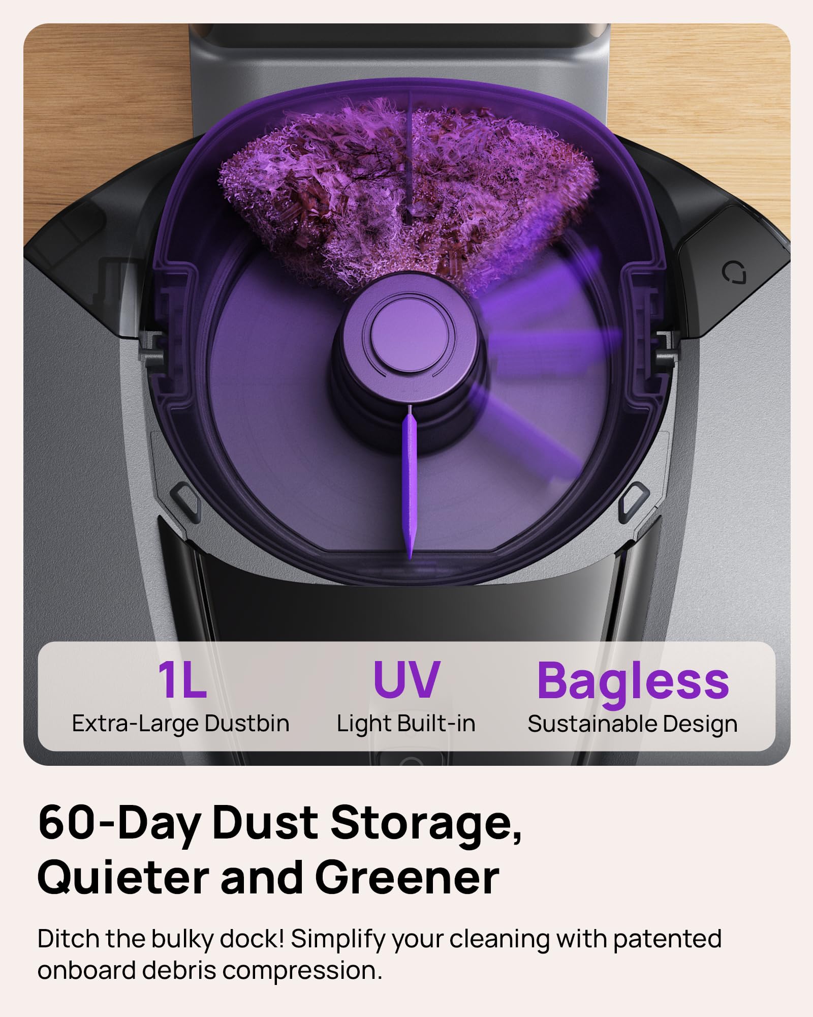 - No Emptying for 60 Days: All-new patented onboard debris compression lets you ditch the bulky self-empty station! G10+ bagless robotic vacuum quietly collects and compacts debris in the spacious 1L dustbin, and keeps the interior hygienic with built-in UV light.