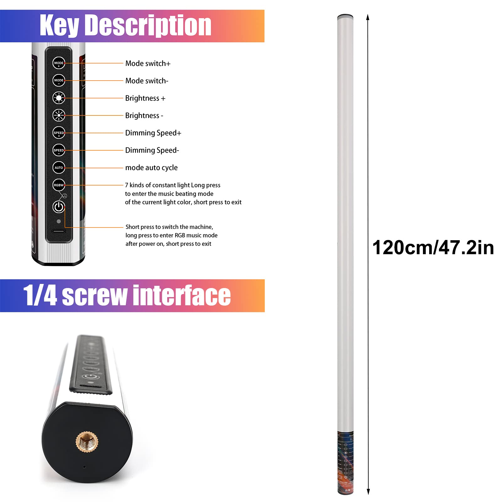 - 【Handheld and Multi-function 】 The music video tube lights are light weight, they can be handheld for Selfie,light painting, DJ lighting, also you can fix them on the wall for Museum or Exhbition Center, and sure you can put them on tripods for Stage and Night Bar lighting, even as ceiling lighting to create a mood for your house,bedroom or nursery room. The video light can work all the time (The RGB tube lights can work regularly on being charge)