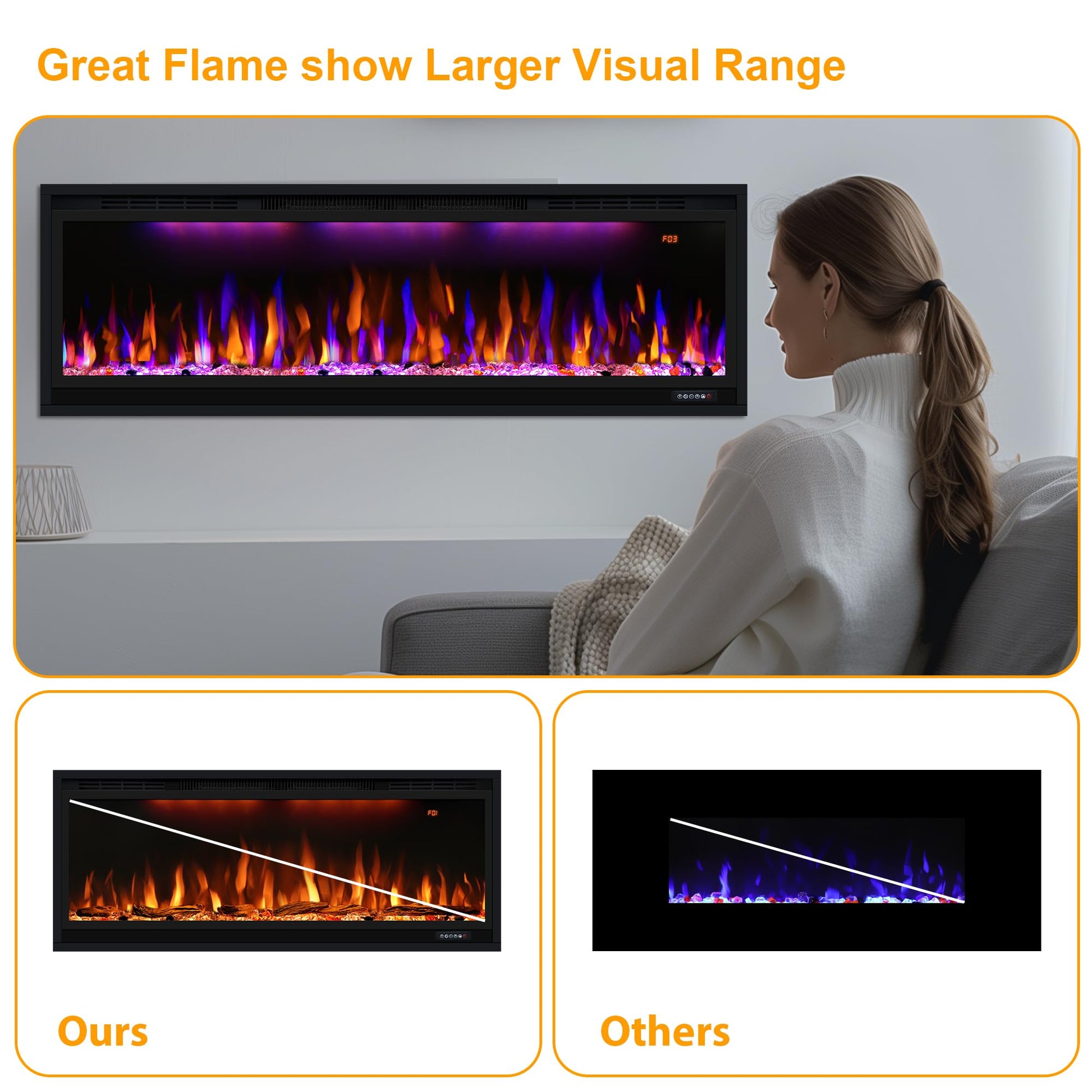 - 🔥Two Installation methods: Flush mount and in-wall recessed. When installing the fireplace insert, please noted the size of the insert part of the fireplace heater. FOR 60'WIFI SIZE is: 60' X 5.85' X 15.75'(WDH), and the hanging bracket comes with the item fixed on the back board of the black fireplace that can be removed when hang on the wall. And the overall dimensions of the whole fireplace are: 62.26' X 6.30' X 17.72'(WDH). 6ft cable for plug into the Power.