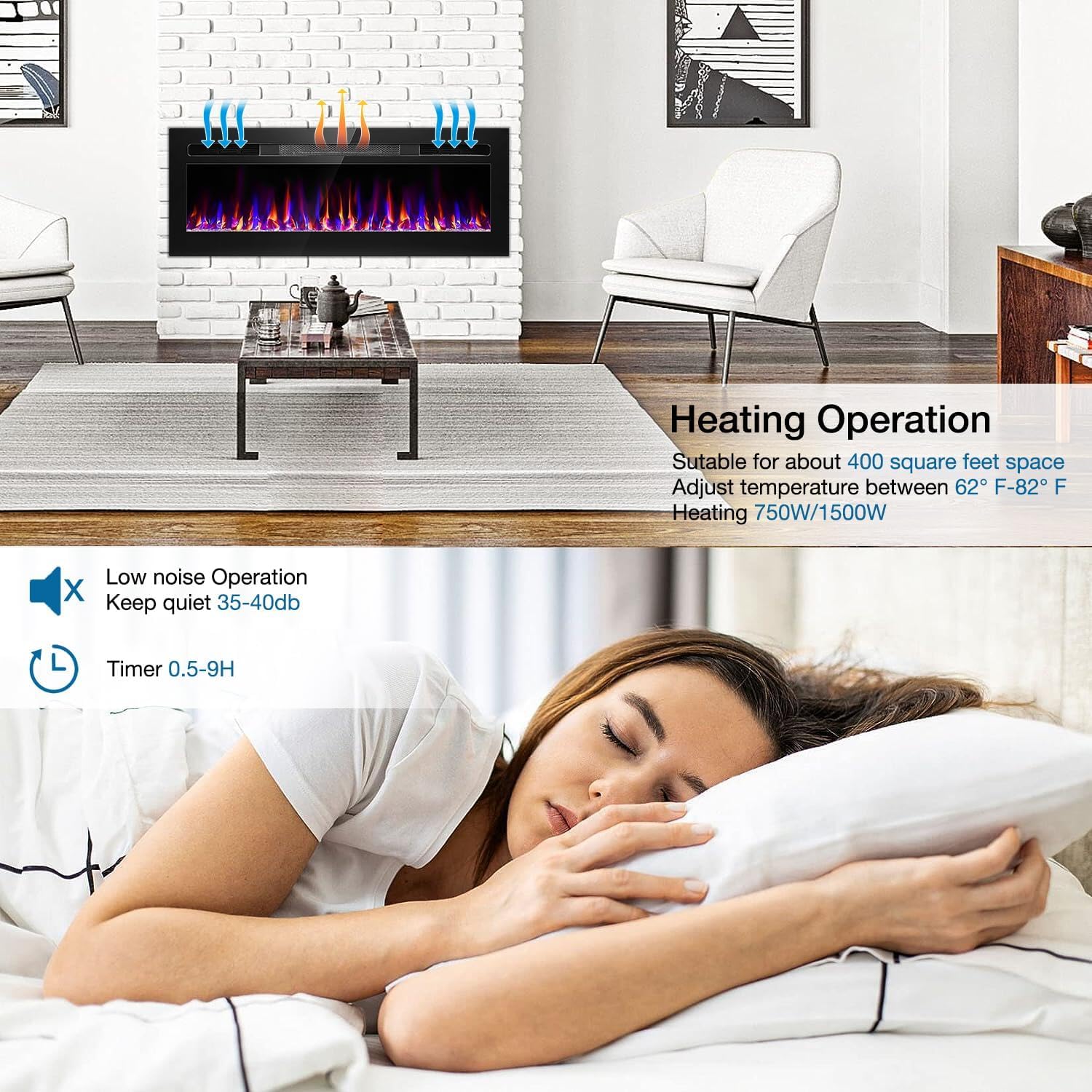 - 【Energy Saving & Temperature Controller】The fireplace is safe and saves a lot of energy which is because of its two important modes 750W & 1500W which can be adjusted accordingly by controlling room temperature from 62°F to 82°F with the supplemental zone heating for up to 400 square feet.