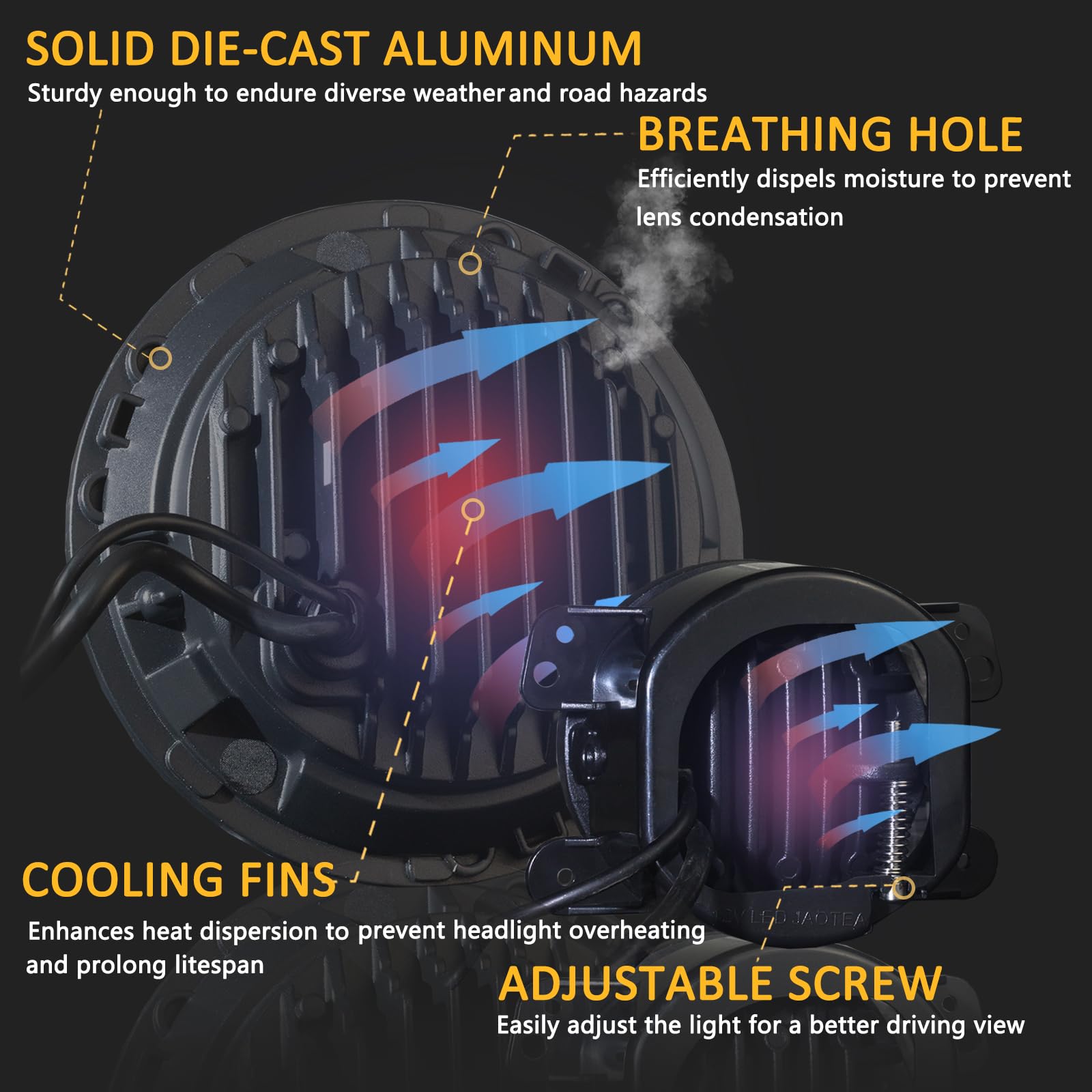 - 【High Speed Cooling】 The LED headlight is made of durable DIE-Casting aluminum housing and polycarbonate lens, Ribbed Design for Efficient Cooling.strong heat conductivity, antiseptic, anti-aging, weather resistance, dustproof, energy saving.Built-in EMC system, can reduce radio interference.It can maintain normal operation even in harsh environments such as deserts and snowy days.