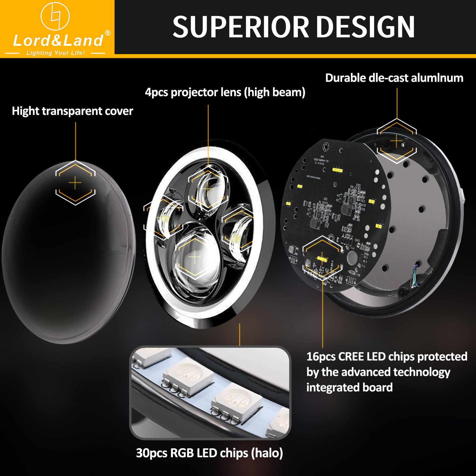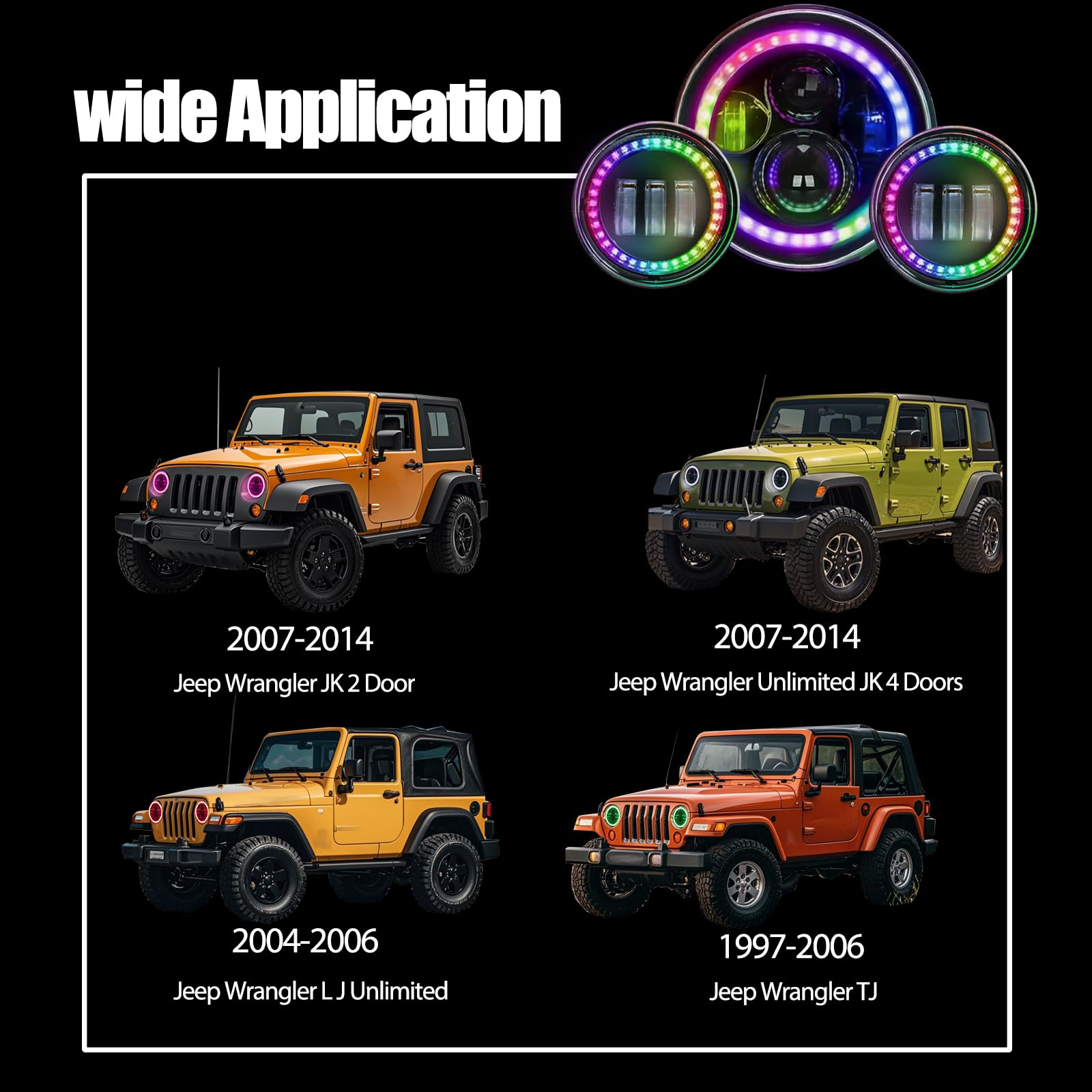 - 【Multifunctional Adjustable Mode】 7 Inch LED headlight for Jeep Wrangler headlights with Bluetooth controlled ,200 kinds RGB Mode Selection,'led light' Phone App controlled,Ios and Android compatible,timing function,music mode,DIY colors,flashing function,automatic control.Newest Fantastic Design LED Headlight With Halo Angel Eyes DRL for Jeep Wrangler headlights LED replaces original halogen and HID headlight.