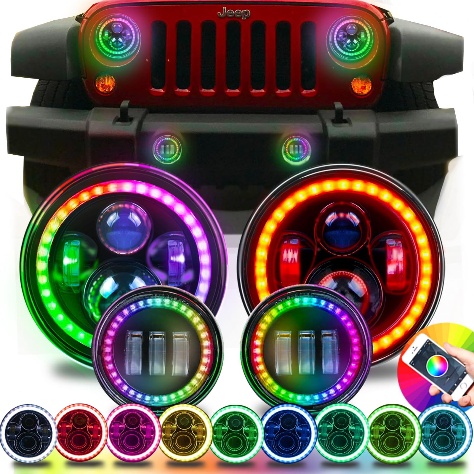 7" RGB Headlights & 4" Fog Lights Combo with Bluetooth Controlled Custom Colors,Music Mode, IP67 Waterproof DOT Kits,for 2007-2018 JK/JKU, 1997-2006 TJ, 2004-2006 LJ, 76-86 CJ