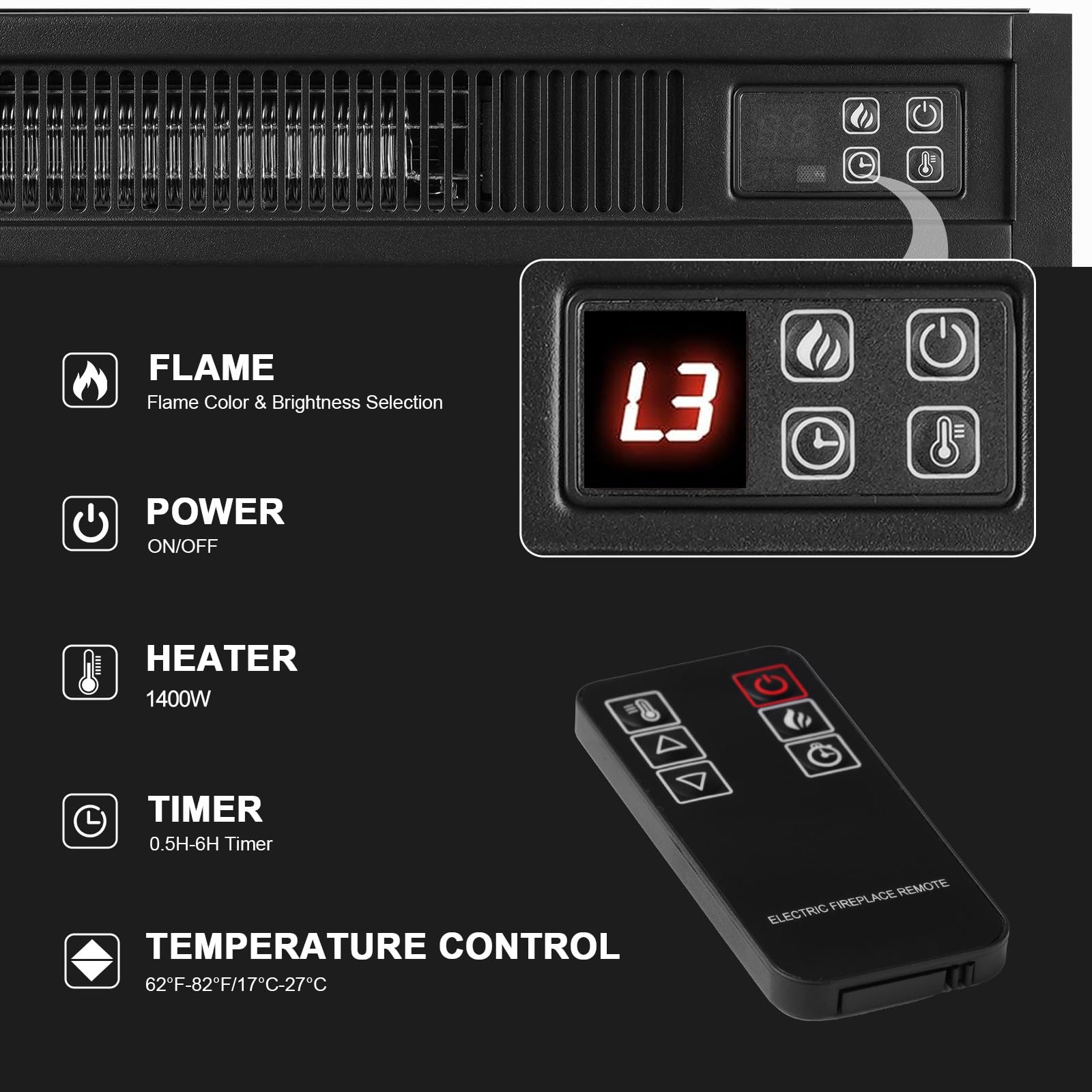 - 【Fireplace Size & Parameters】: Dimension: 23’’(W) ×6.32’’(D) × 17.1’’(H). There are 22 levels to adjust the temperature from 62°F to 82°F. you can adjust the heating level(high/1400W or low/750W) according to your preference. A built-in timer for auto-shut off can be set up to 6H. Safety cut-off device for overheating protection will automatically power off at once when the heater tip is over. Safe for you and family.