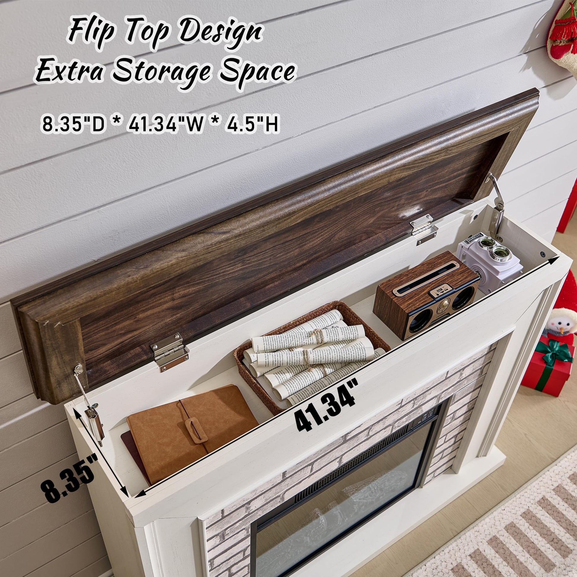 - 【Extra Storage Space】The electric fireplace with mantel features a hidden flip-top design with premium hinges that opens easily and silently, allowing you to place magazines, gamepads, remotes, and more