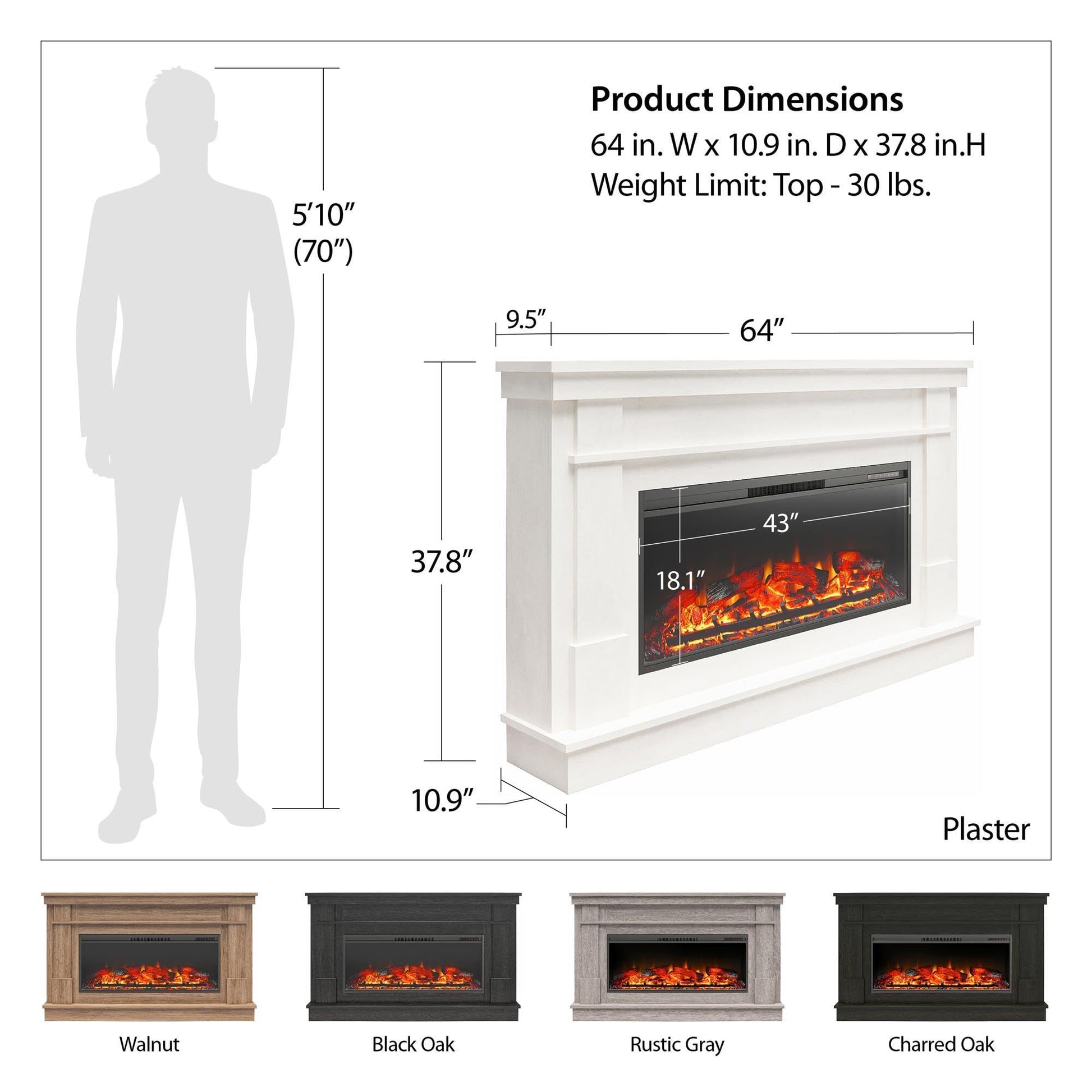 Details: Easily give your home a cozy and welcoming upgrade with the Ameriwood Home Elmcroft Wide Mantel with Linear Electric Fireplace. Perfect for the modern farmhouse or contemporary craftsman, the Elmcroft features a wide linear insert with realistic logs and grate. The wide mantel offers plentiful space for décor and family photos. Constructed from laminated MDF and particleboard, the Elmcroft comes in several beautiful neutral finishes to match any décor. Control the Fireplace flame setting with the included remote control or by the touch panel and choose to enjoy your Fireplace with or without the heat setting while still allowing the flames to give off their calming feel. This fireplace insert is powerful enough to heat up a room up to 400 square feet and features adjustable temperature control to keep your room at the perfect temperature. The Mantel with Linear Electric Fireplace ships flat to your door and requires assembly. Two adults are recommended to assemble and move. Once assembled, the unit measures to be 37.76' H x 64' W x 10.9' D.