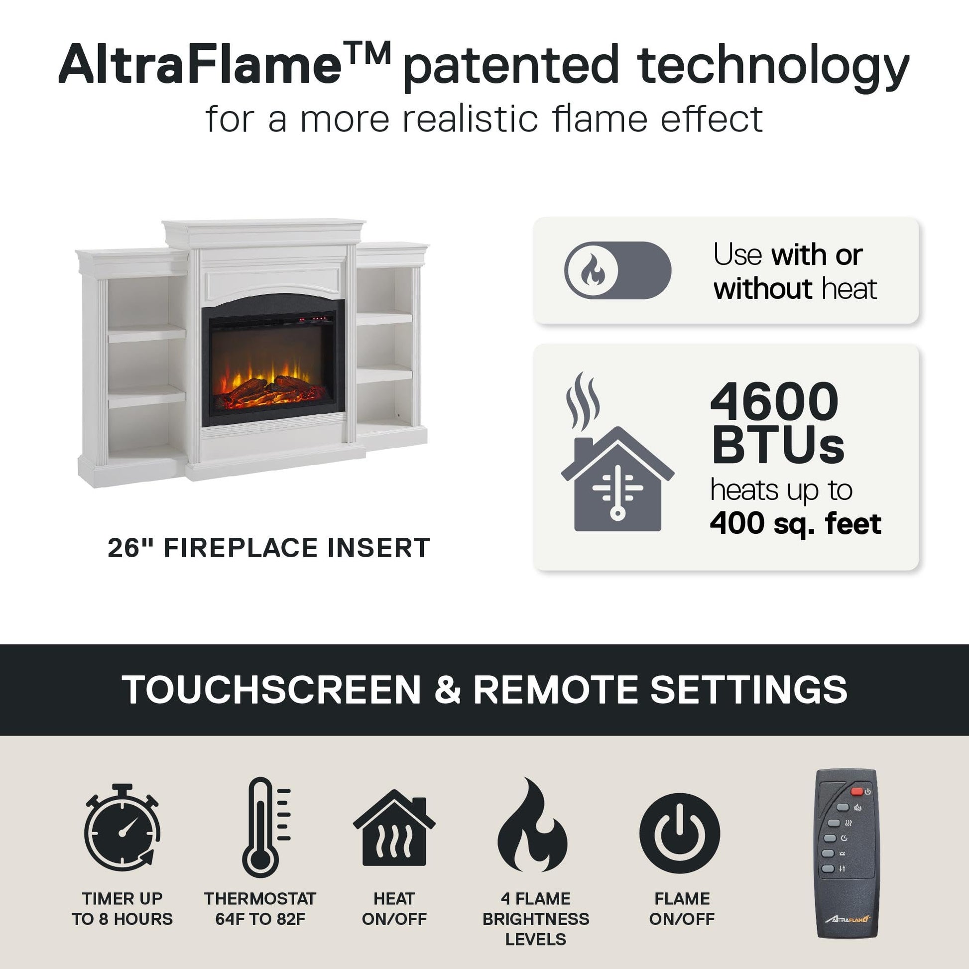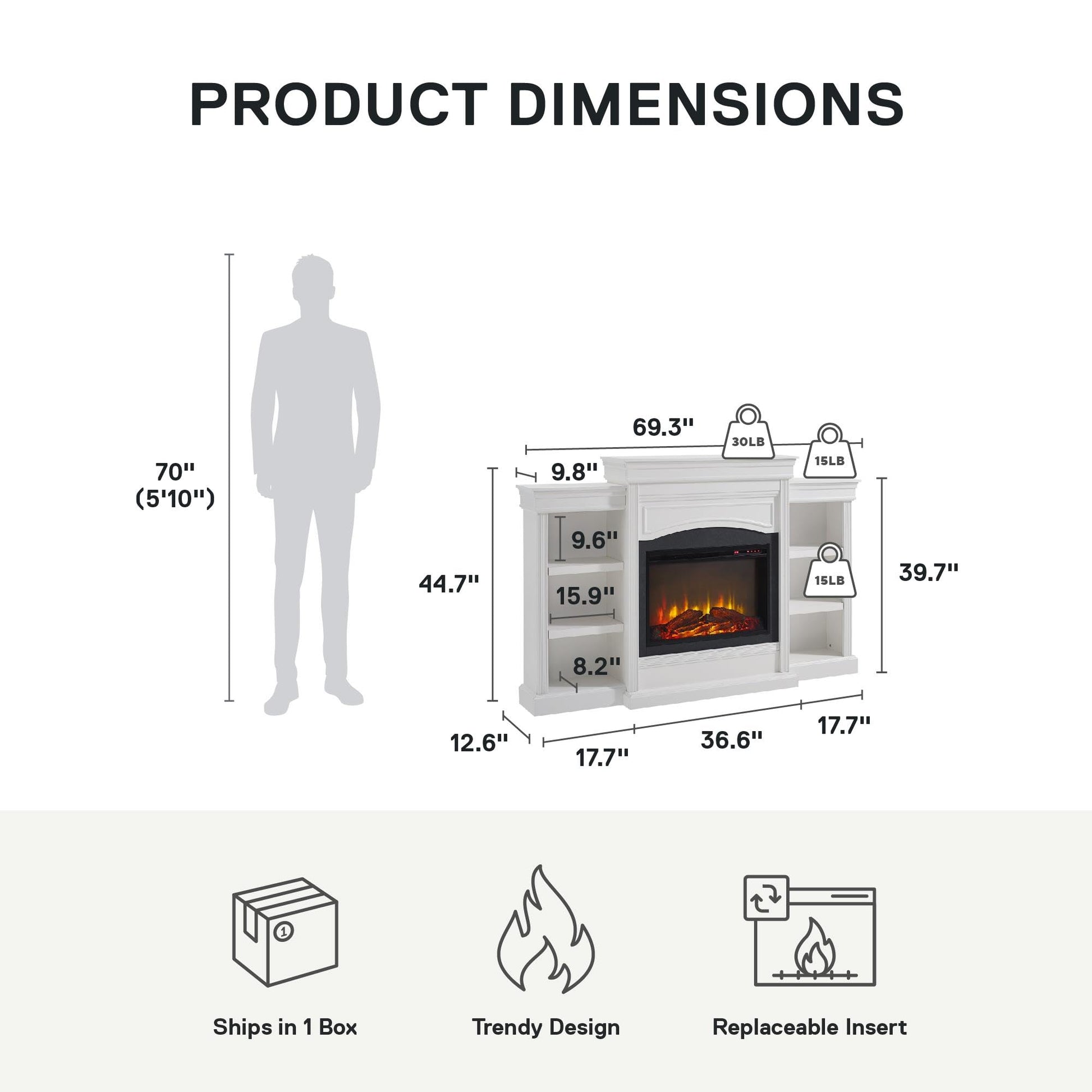 Ameriwood Home Lamont 69 Inch Electric Fireplace with Mantel, Shelves, Replaceable Fireplace Insert Heater, Remote Control, Timer, Realistic Log and Flame Effect, For Living Room or Bedroom, White