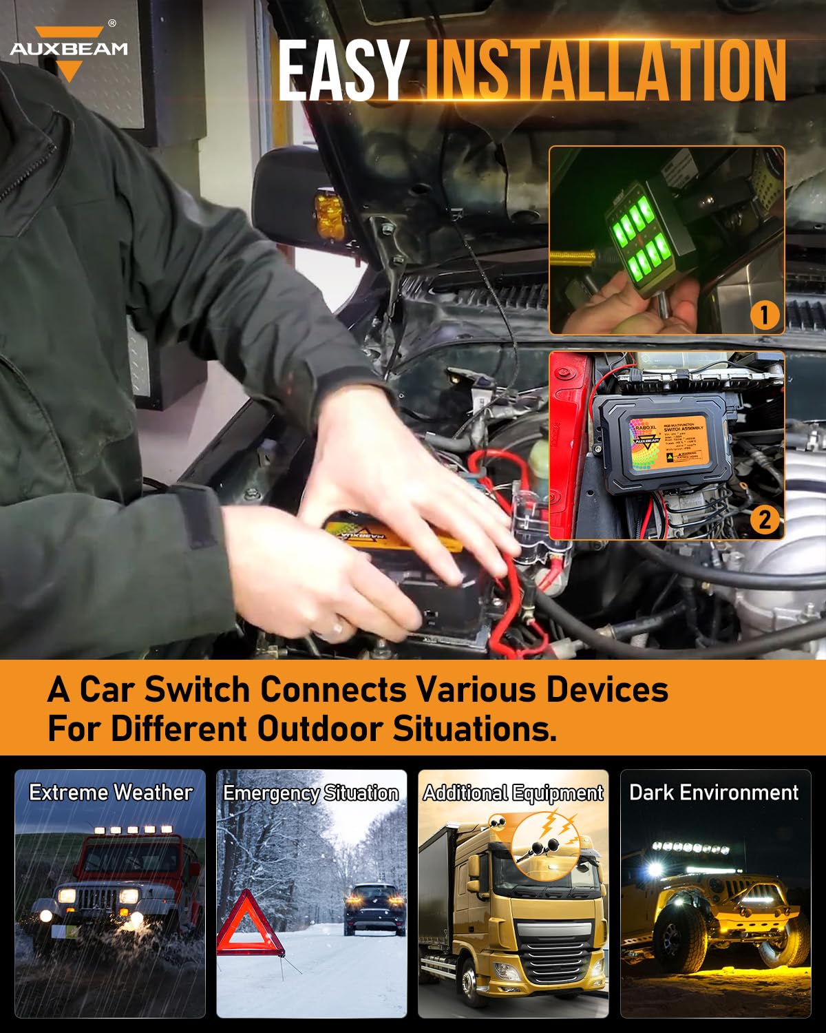 - Auxbeam 8 Way Accessory Switch Panel. Allows you to control up to 8 different led lights or electrical devices. It can be installed in any DC 12-24V vehicles such as Suvs, Atvs, Utvs, 4 Wheelers, Trucks, Rvs, Campers, Trailers, Boats, etc.