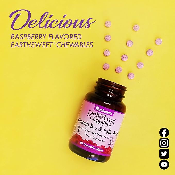 Bluebonnet Nutrition Earth Sweet Vitamin B12 1000 mcg & Folic Acid 400mcg Brain Health & Energy* Vitamins for Women & Men - Vegan, Gluten-Free Raspberry B 12 Vitamin - 180 Chewable Tablets