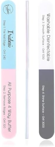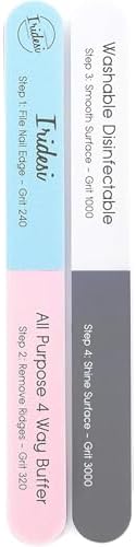- GRITS AND COLORS. WHAT YOU GET. Each grit has been carefully selected so you will be able to file, buff and shine your fingernails with just one nail file. Step 1 is a beautiful medium blue 240 grit, Step 2 is a pink 320 grit, Step 3 is a white 1000 grit and Step 4 is the gray 3000 shiner grit. Your order will come with a bulk set of 12 emery boards that are 7 inches long and 3/4 of an inch wide. Perfect buffers for men and women or a valentine's day gift for a best friend.