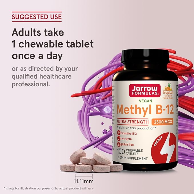 Jarrow Formulas Ultra Strength Methyl B-12, Dietary Supplement for Cellular Energy Production, 100 Tropical-Flavored Chewable Tablets, Up to a 100 Day Supply