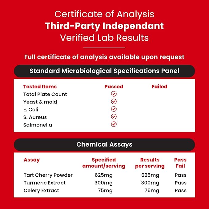 - Third-Party Tested for Quality: Every batch of our tart cherry capsules undergoes rigorous third-party testing for purity, potency, and safety. Trust in a product designed to deliver maximum results with complete transparency.