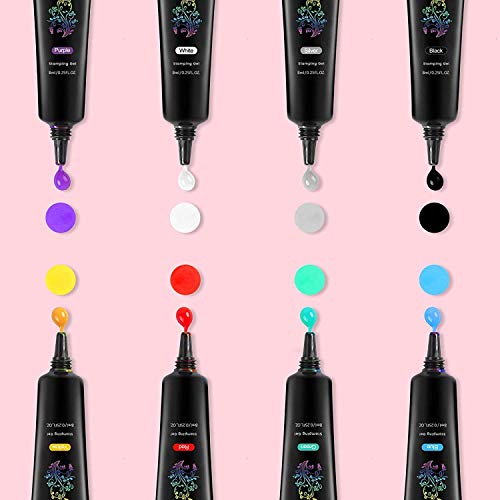 - 【Biutee Stamping polish gel】 This package includes 8*8ml nail art stamping gels with different colors (Black, White, Blue, Gold, Green, Purple, Red, Silver).Each color will meet with different patterns,it also can improve your DIY skill.