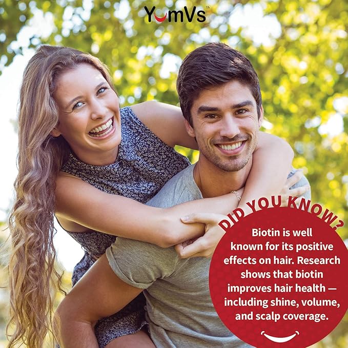 - BIOTIN VITAMINS FOR HAIR, SKIN & NAILS Daily dietary supplement for adults, YumVs raspberry flavor vitamin gummies support Hair, Skin & Nail health. Our maximum potency Biotin vitamins contain 10,000 mcg per serving – a daily boost for your overall health!