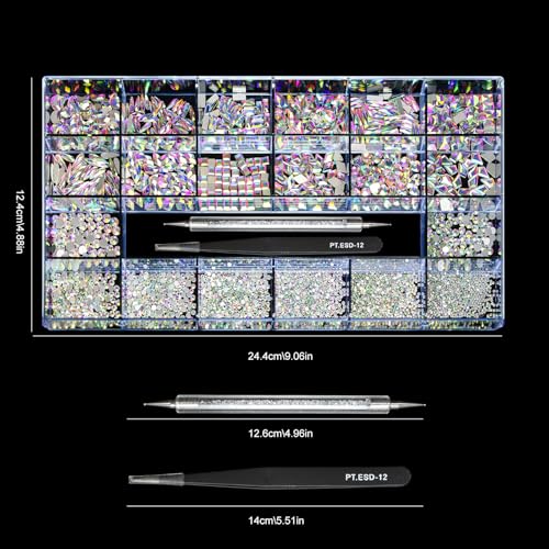 12 Types of 600 Crystal AB Diamonds + 2500 Flat Rhinestones Mix 20 Styles Flatback DIY Crafts Rhinestone Crystals 3D Ornaments Flat Back Stones Set + Tweezers + Drill Pen