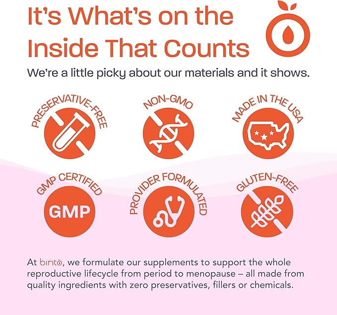 - HIGH-QUALITY INGREDIENTS MADE IN THE USA : At Binto, we believe in clean, healthy products. That's why all our women's health products and supplements are made in GMP certified facilities in the USA with non-GMO, preservative-free, and gluten-free ingredients