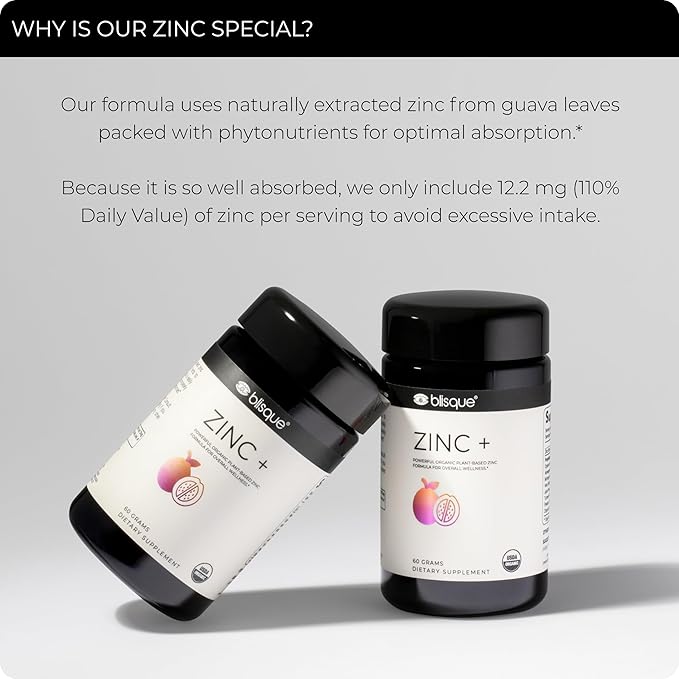 - PREMIUM ORGANIC QUALITY: Blisque ZINC + uses only certified organic ingredients that you can feel good about. It's manufactured in the USA in a state-of-the-art certified cGMP NSF facility. We AVOID fillers and harmful components, including animal by-products, artificial colors, artificial preservatives, artificial sweeteners, corn, gluten, magnesium stearate, parabens, soy, silicon dioxide, and wheat. Why? Because your well-being is our priority.