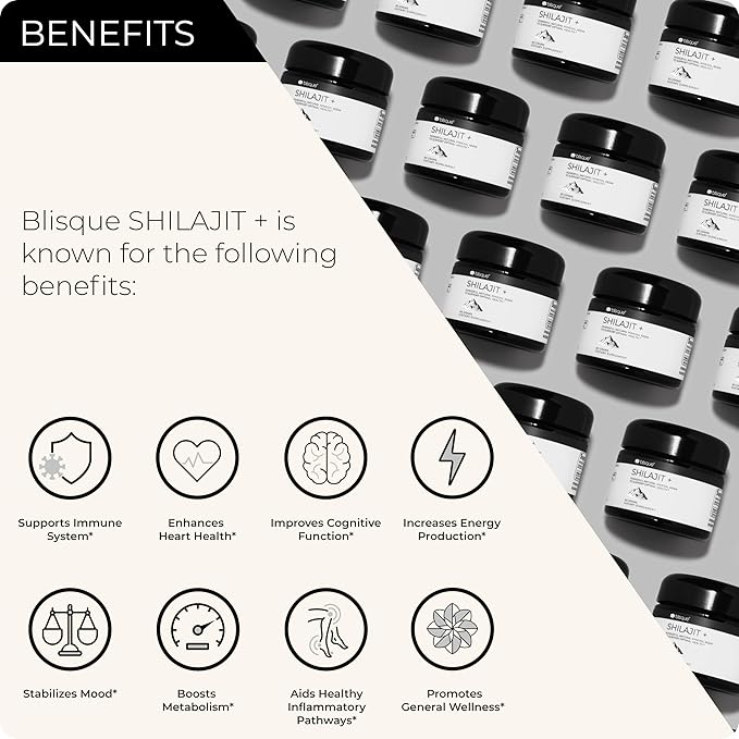 - PROMOTE OVERALL WELL-BEING: Blisque SHILAJIT + is a comprehensive supplement that enhances your well-being. It will support your immune system, improve heart health, act as a brain booster, supercharge you with energy, stabilize your mood, and aid a healthy inflammatory response.*