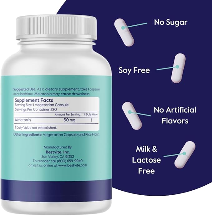- PURE & HIGH STRENGTH FORMULA: Bestvite Melatonin contains no stearates, is non-GMO, gluten-free, vegan, and comes free of unwanted added ingredients. Each capsule contains 30 mg of Melatonin.