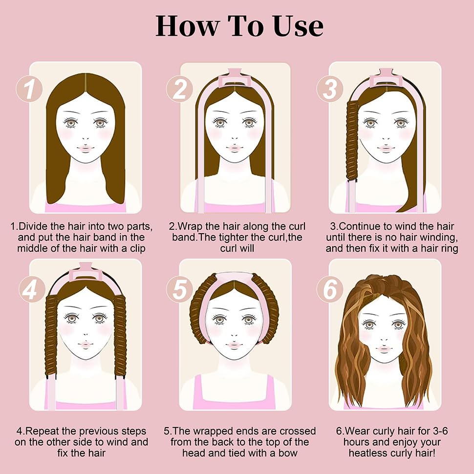 - Easy to Use & Tips---1. Lightly damp your hair or drying your hair to slightly damp after shower 2. Fix the middle part of the curling iron on the top of the head with a bobby pin. 3. Wrap the hair on both sides around the curling iron respectively. When the hair is braided to the end, secure it with a hair tie. 4. Cross the two ends of the hair band behind the head, tie a knot in front of the hairpin on the top of the head, and remove the hairpin. TIPS: Spary with styling to last longer.