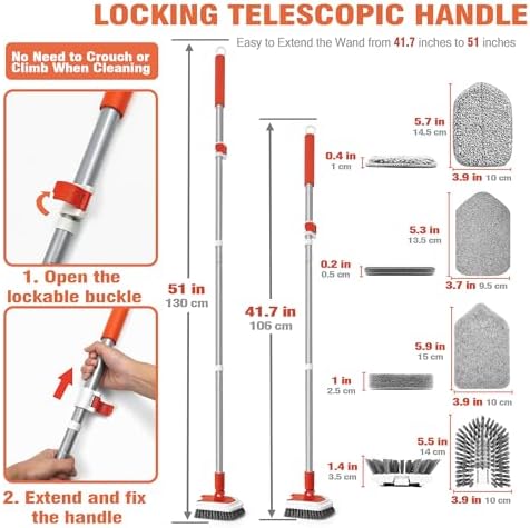 - 4 Replaceable Brush Head: The long scrub brush is equipped with 4 different brush head. The steel wool scrubs tough spots; the microfiber pad tackles sensitive surface; the scouring pad cleans tubs; and the stiff bristles brush removes stubborn stains