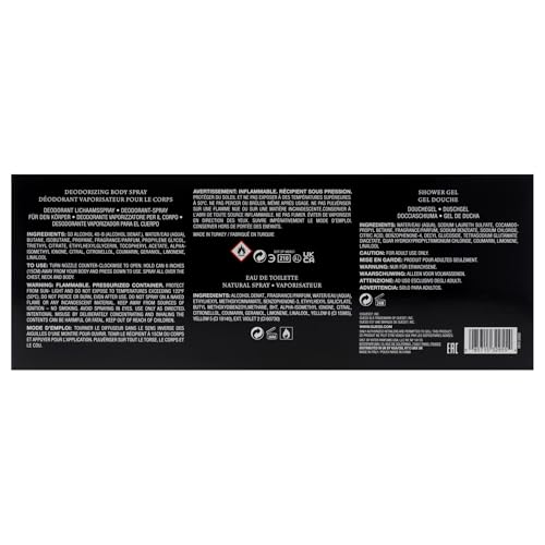 - Usage instructions: Spray EDT on pulse points, use deodorizing body spray as needed, and lather shower gel during shower