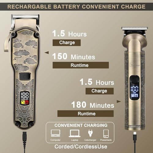 - 【Large battery capacity, long battery life for all-day use】1.5 hour of fully charge, provide up to 150 mins running of the hair clipper and 180mins running of hair trimmer(Fully charge the battery before first use). One full charge can support multiple uses, eliminating the need for frequent charging. Convenient USB charging available anytime, anywhere.