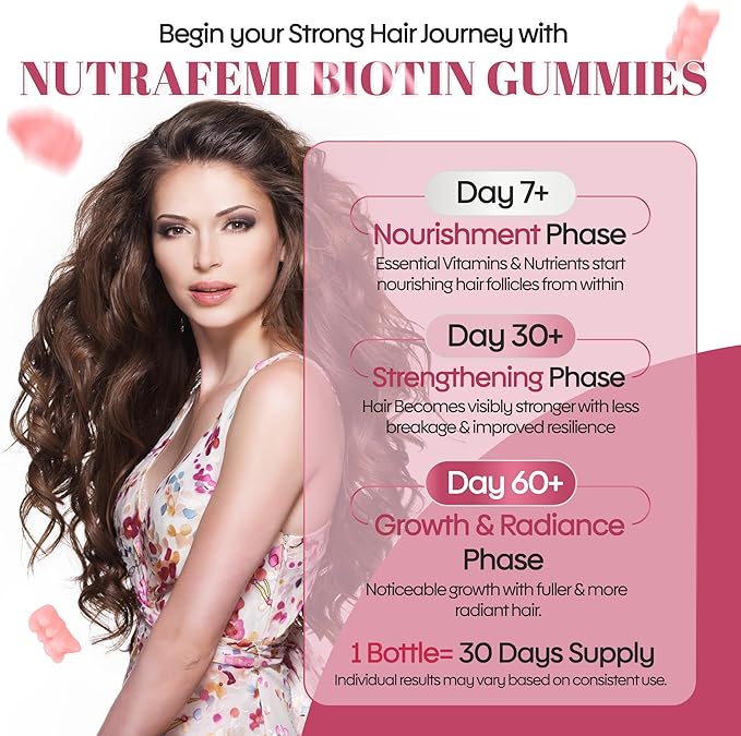 - 🌱 Promotes Stronger, Healthier Hair – Our premium hair vitamin gummies are packed with key nutrients like Biotin, Vitamin C, Vitamin E, and Folic Acid to help support healthy hair growth, improve hair strength, and enhance overall hair vitality. These essential vitamins nourish your scalp and follicles, giving you thicker, shinier, and more resilient hair from the inside out.
