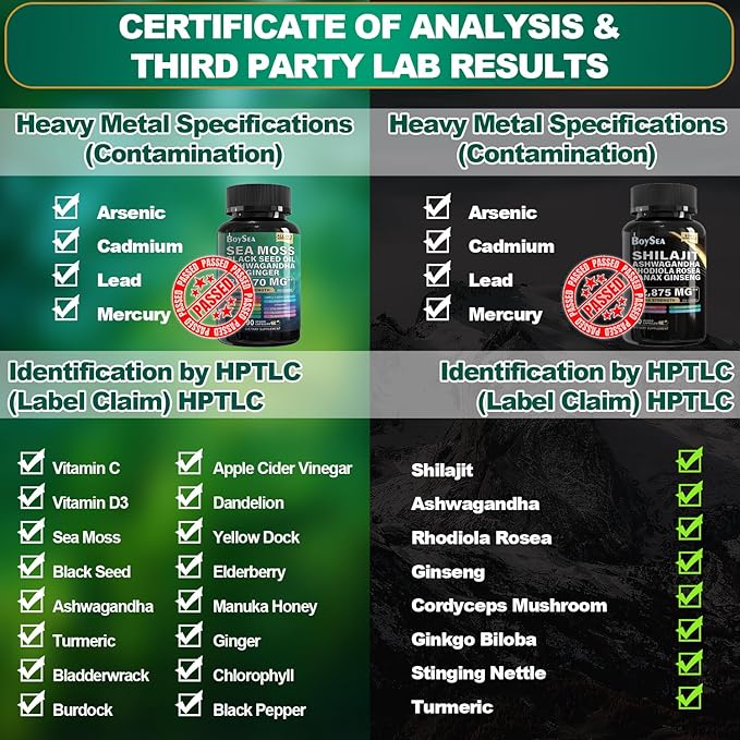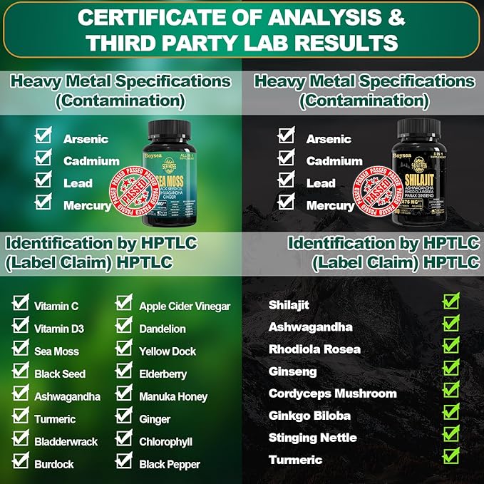 - 【COMPLETE NUTRITION】 - Boysea's Shilajit and Sea Moss, Each in his own bottle, provide a balanced 8-in-1 and all-in-1 supplements, respectively. This bundle delivers a diverse range of nutrients, providing a complete and convenient health solution.