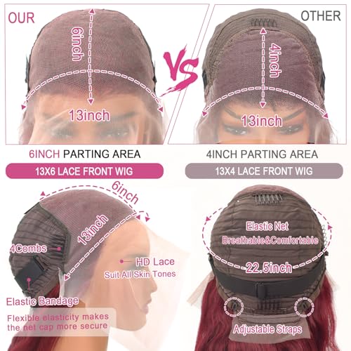 - 【99j Burgundy Lace Front Wigs Human Hair Cap Size】: 13x6 Lace Front Wigs Human Hair, Average Cap Size (22-22.5 Inch)With 4 Combs and Two Adjustable Straps Make It Easy to Install, Breathable & Durable Lace Material Make It More Comfortable, You Will Feel Like Your Own Hair.