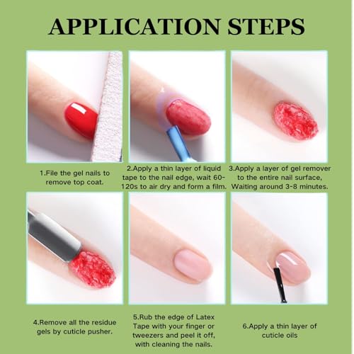- 【Nail Polish Remover Instructions】Use a nail file strip to remove the top coat, apply the liquid latex to the edge of the nails (avoid getting gel nail remover on your skin), then apply the nail gel remover and wait for 3-5 minutes, the nail will automatically burst, clean the remaining gel nail polish, and finally apply the cuticle oil.