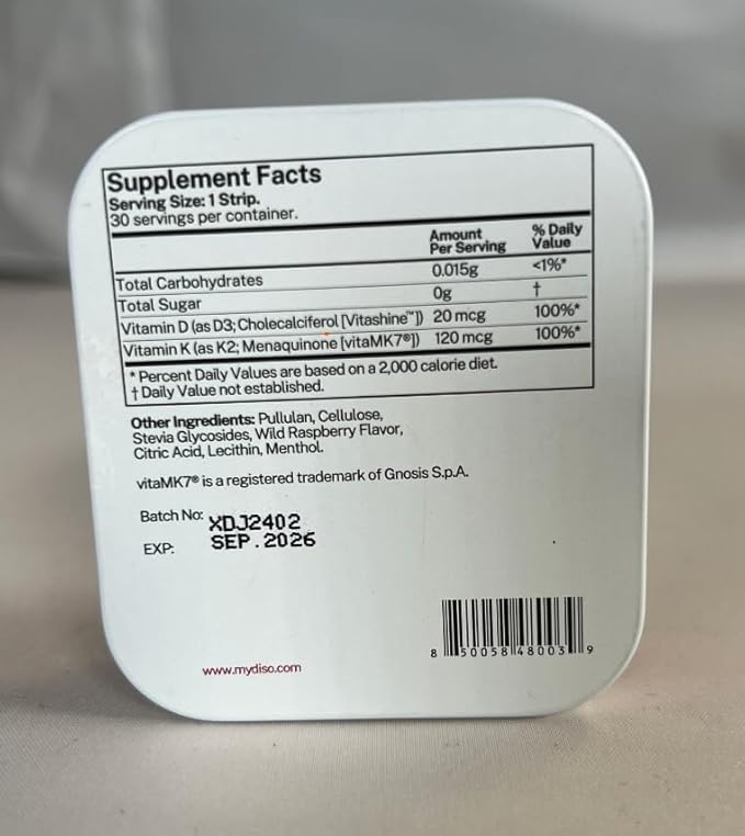 - ZINGY RASPBERRY FLAVOR: Enjoy a zesty burst of raspberry every single time you take your D3 and Vitamin K2 supplement. HANDY AND CONVENIENT: Compact and portable, take your Diso K2 and Vitamin D3 supplement on the go! HIGH ABSORPTION: Feel the benefits of your D3 and K2 supplement with our high-absorption dissolving strips.