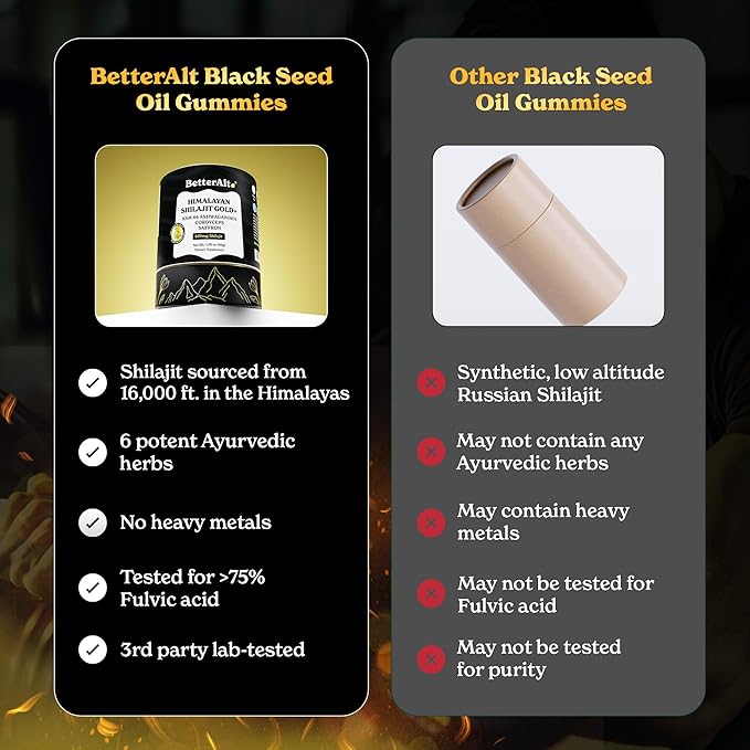 - Premium Shilajit Formula: BetterAlt Himalayan Shilajit Gold + combines the power of 85+ trace minerals, 75% fulvic acid, Cordyceps, and KSM-66 Ashwagandha to promote energy, vitality, and overall well-being for both men and women.