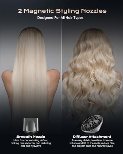 - 【Low Noise & Magnetic Attachments】 Experience the serenity of our hair dryer at just 51 dB, perfect for early morning or late-night styling. Its lightweight, compact design makes it ideal for travel and everyday use. Achieve any hairstyle with 2 magnetic attachments, including a smoothing nozzle and a curl-enhancing diffuser.