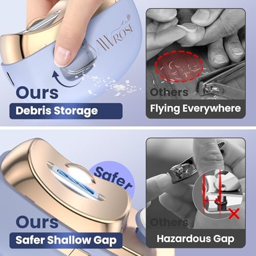 - 【Safer & Reliable Nail Trimming】Our baby nail clippers designs a safety trimming distance that secures easy and precise cutting without pinching or over-trimming, safer than those sharp traditional finger nail clippers adult with deep caliber. The built-in LED light ensures precision in dim lighting, while the low-noise operation is ideal for sensitive sleepers.