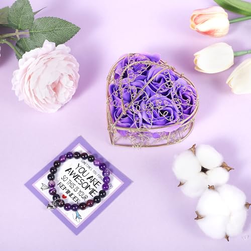 - đă16PCS SELF CARE GIFTS FOR WOMENăStill looking for a luxury gift baskets for women to offers an unforgettable unboxing experience? HAPFRJIN unique birthday box for woman contains all carefully designed lavender items, come with gift card, lavender bath bomb, diamond handmade bath soap, coral velvet bear towel, plush fuzzy socks, handmade crochet gifts, purple agate stretch rope bracelet, lavender scented bath salt, silk eye mask, straw, 40 0z insulated tumbler, exquisite gift box,scrunchies, lavender shower tablets rose shower tablets, 4oz scented candle, flannel blanket,floral soap.