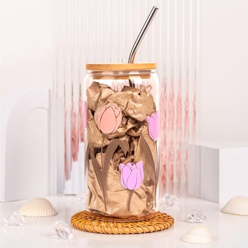 - TULIPS DESIGN ICED COFFEE CUP: Brighten your lady's day with our glass cup featuring a line floral print, perfect for those who cherish a splash of joy and nature in their everyday routine. This tumbler is crafted from high borosilicate glass(Dishwasher safety design), which withstands rapid temperature shifts. It features a natural bamboo lid that enhances the drinking experience.