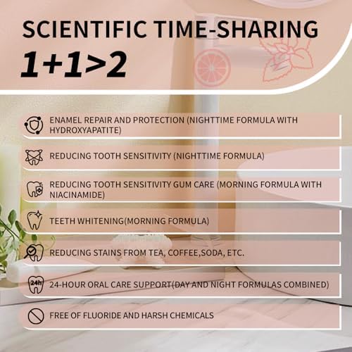 - 24-Hour Comprehensive Oral Care: Our dual-action approach offers 24-hour care by synchronizing niacinamide for gum health during the day and hydroxyapatite for enamel support at night, ensuring your oral wellness is maintained around the clock
