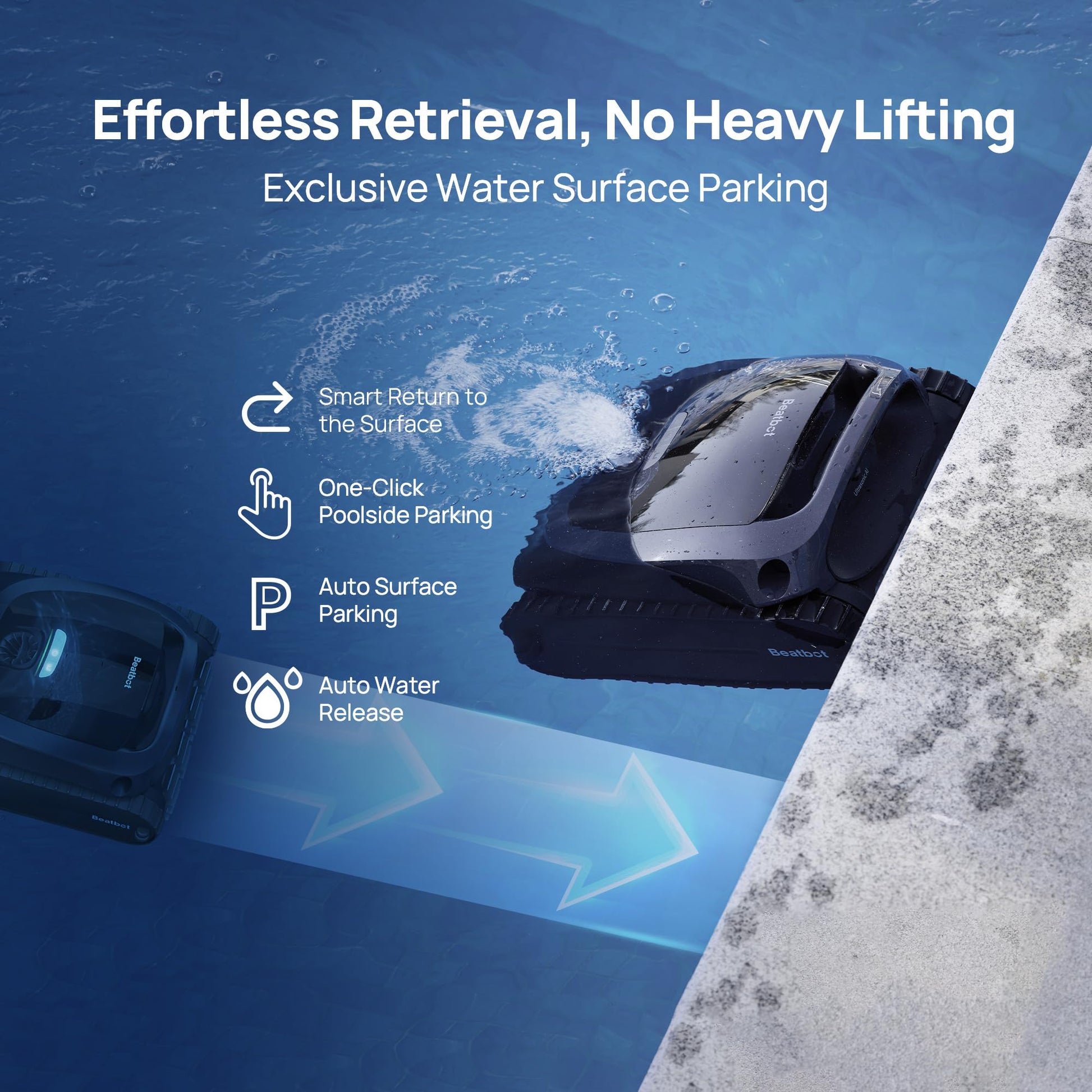 - Effortless Auto Parking – Surfaces automatically after cleaning or when the battery is low. SmartDrain releases water to reduce weight for easy retrieval. One-tap surfacing via the app.