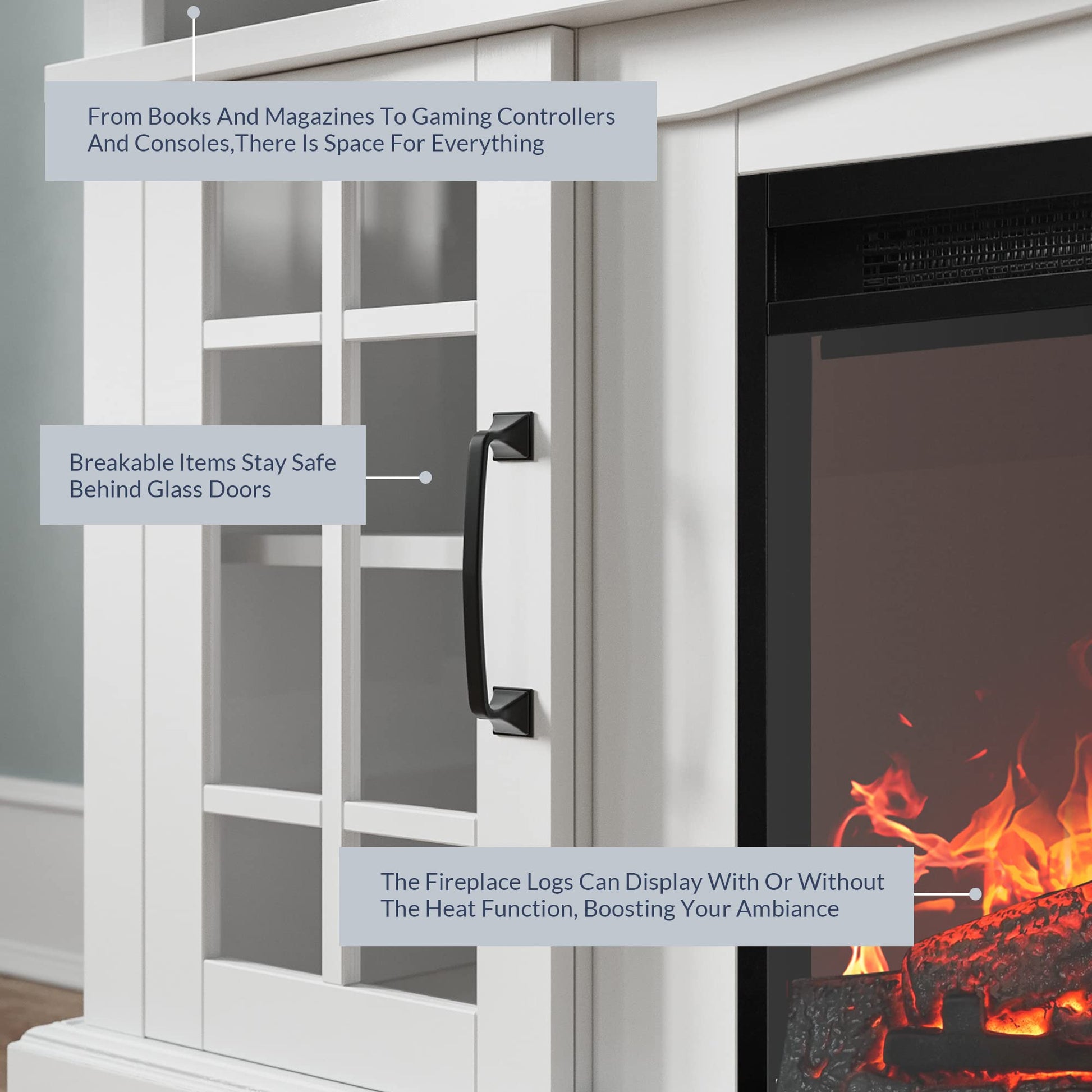 BELLEZE Traditional 58" Rustic TV Stand with 23" Electric Fireplace Heater with Sound, Media Entertainment Center Console Table for TV up to 65" with Open Storage Shelves and Cabinets - White