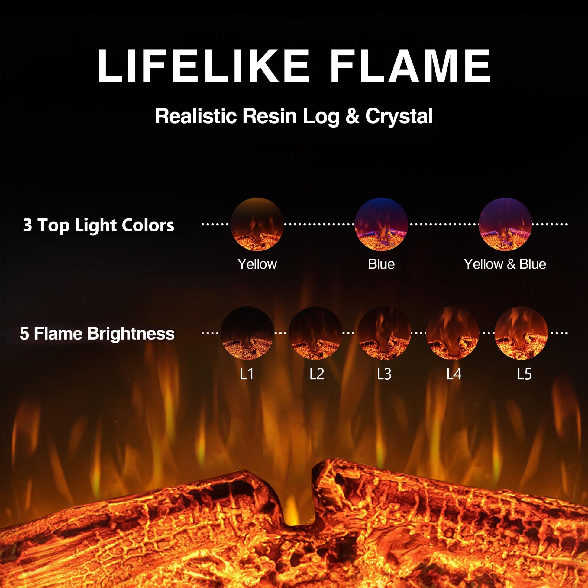 - MULTIPLE OPERATION MODES -- Electric stove fireplace is equipped with a wireless remote control and touch screen, which is simple and convenient. 3 top light color, 5 flame brightness, 1-9 H timer, and built-in speakers who simulate the sound of firewood burning cracking, giving you a real fireplace experience