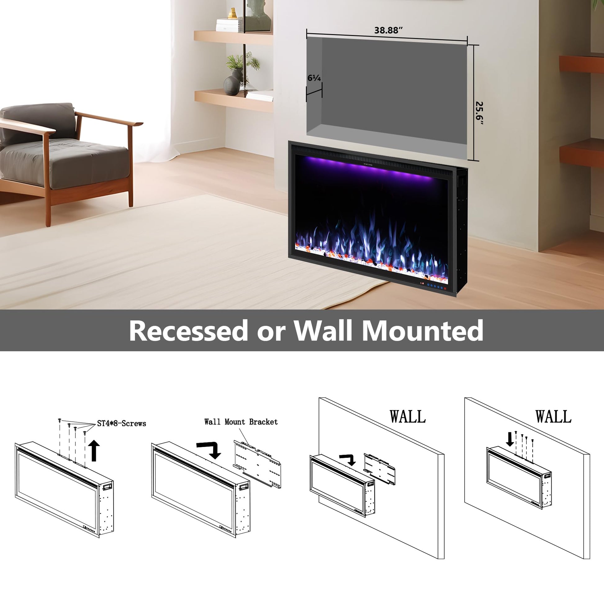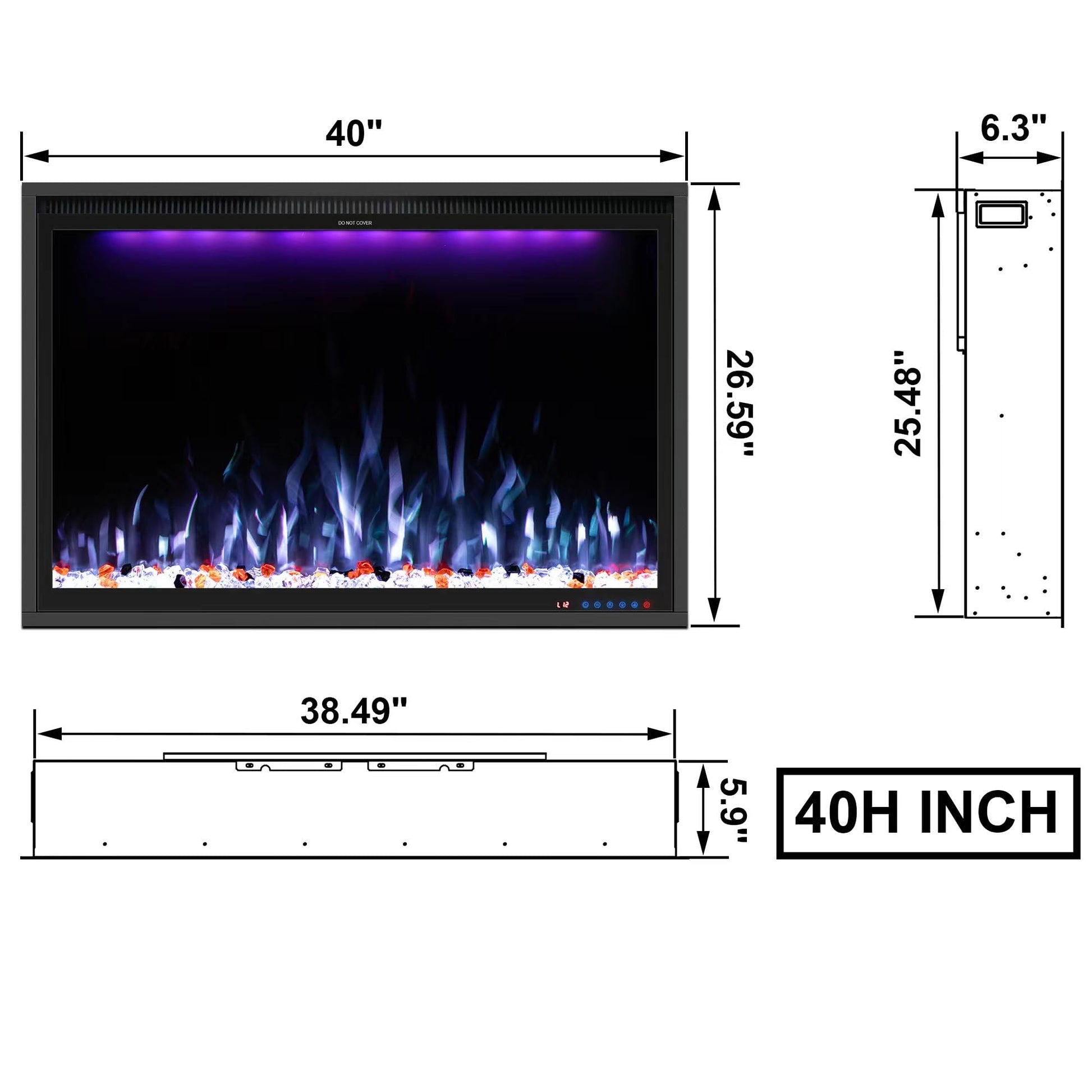 - Available Installations: Electric fireplace heater is created for recessed & wall mounted installation. Insert size: 38.49'*25.48'*5.9', Overall size: 40'*26.59'*6.31'. Premium black metallic body with a glass LED display screen and crystals and logs made of resin material create a unique and stylish design