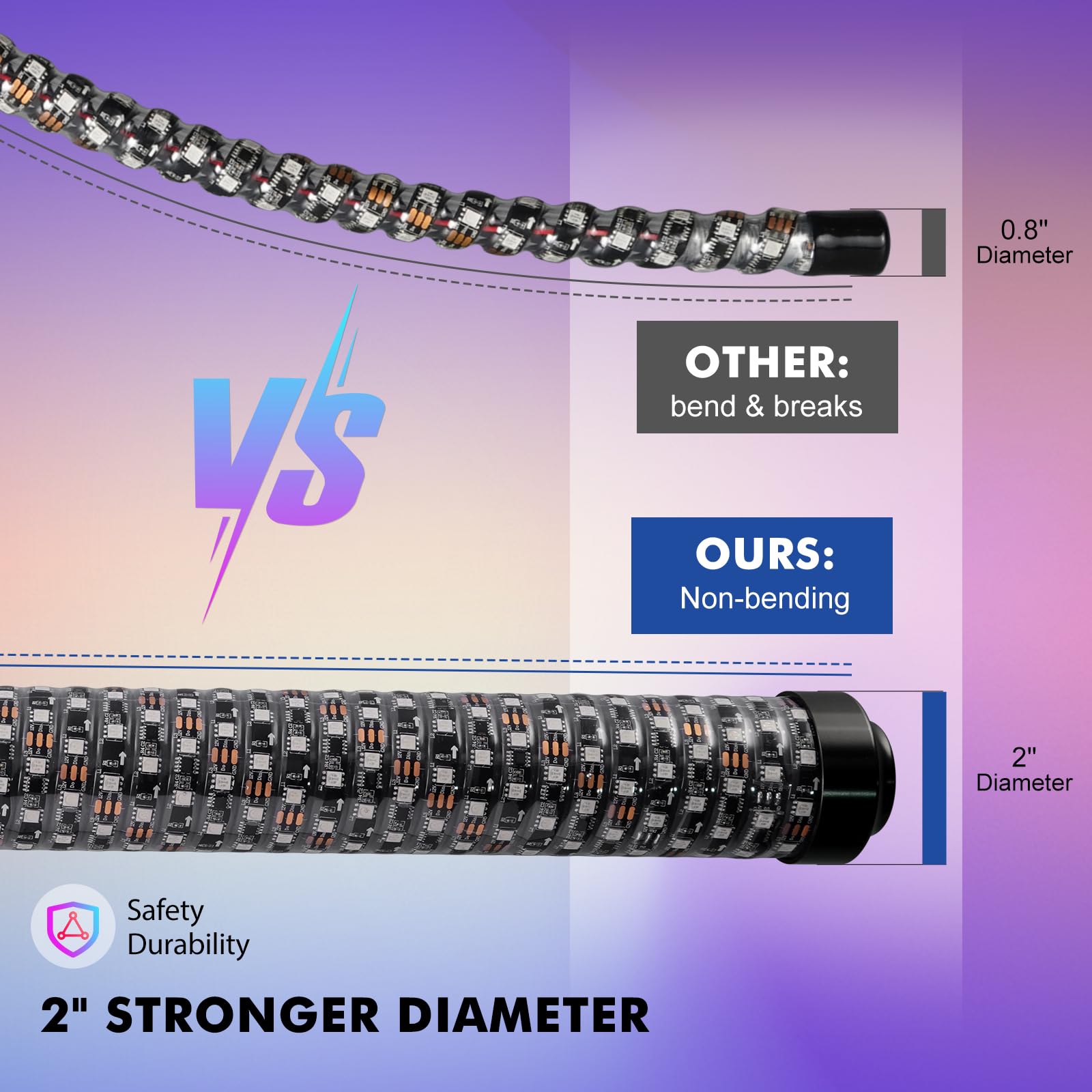 - 【Stronger & Brighter】 Experience the ultimate lighting power with our robust light whips! Unlike regular 0.8' diameter whips, our fat whips feature an impressive 2' diameter that ensures they won't bend or break easily. With a longer lifetime and enhanced durability, these whips are mounted above your cage for maximum impact. Thanks to their thicker diameter, we've packed in 5 times more LEDs than standard whip lights, making them a staggering 250% brighter.