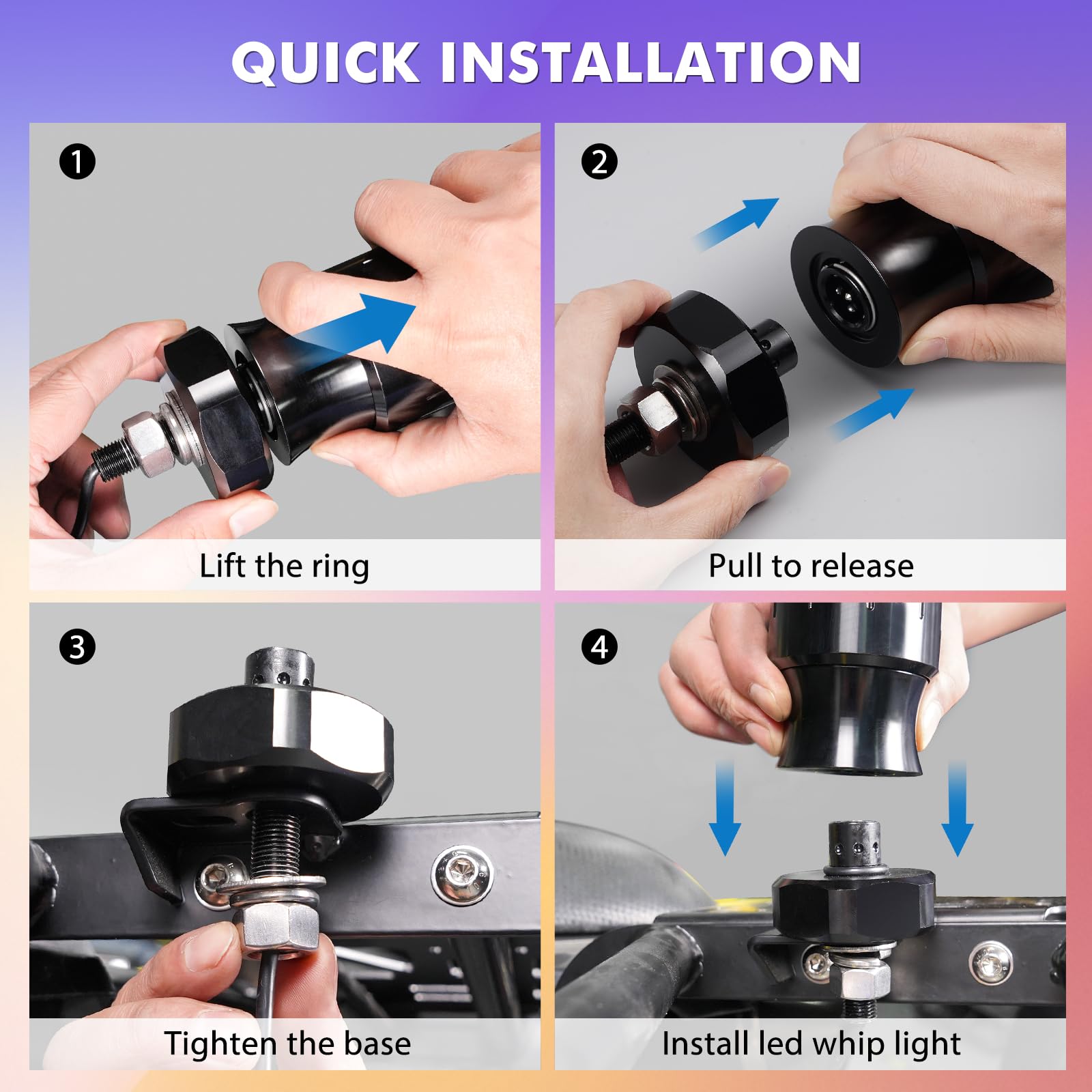 - 【Easy Installation】 Our fat whip lights are suitable for a wide range of vehicles including UTVs, ATVs, trucks, , motorcycles, boats, and more. Installing them is a breeze. Simply release the base, mount it on a 12mm hole, connect the aluminum alloy quick-release base with the whip light, plug the whip lights into the controller wire, and then connect them to the battery. Use the included dust cover to protect the base when not in use.