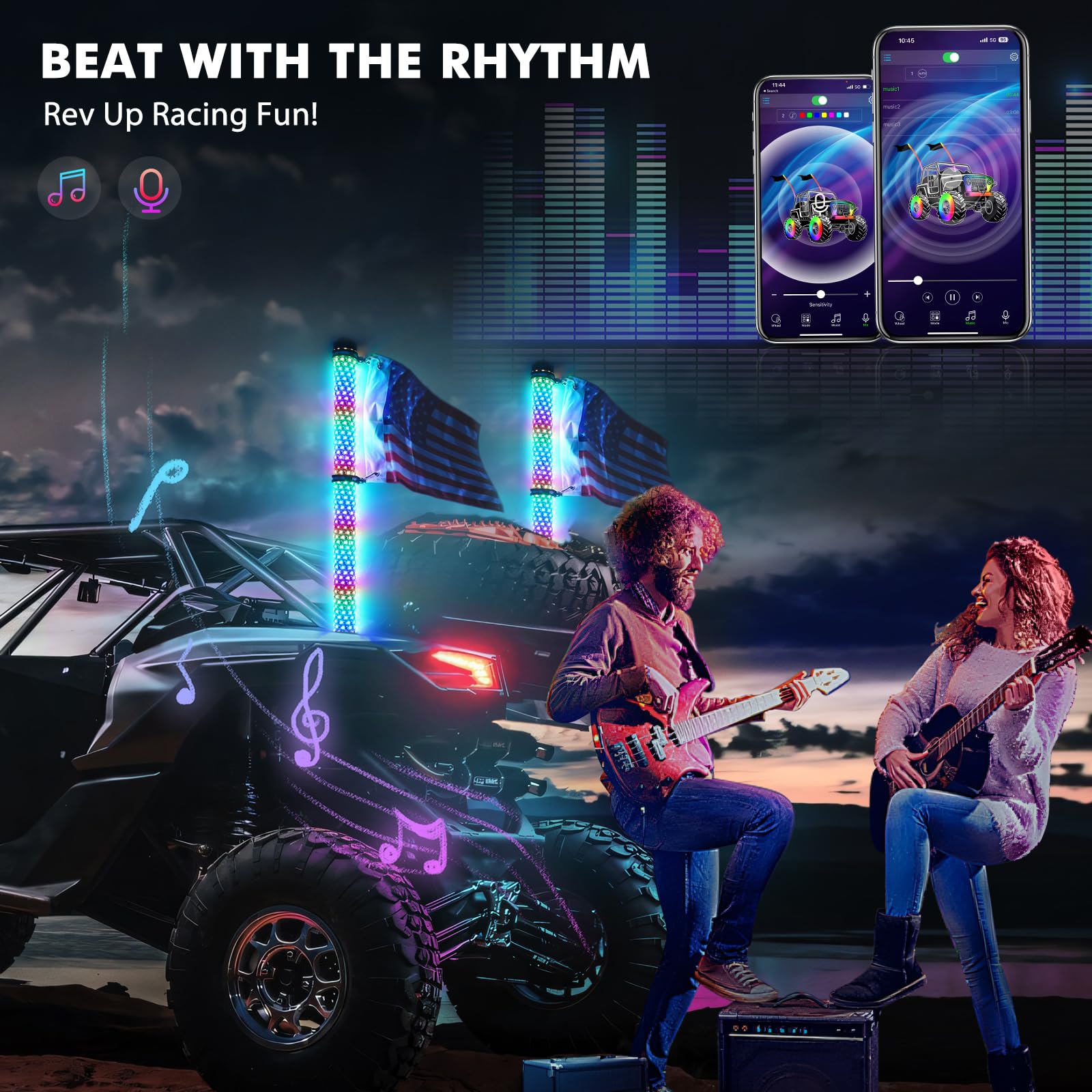 - 【Dual Control & Music Synchronize】 Take control of your lighting experience with ease. Use the remote control to effortlessly switch between 12 solid colors, 200 patterns, 32 brightness levels, and 10 flash speeds. Enjoy the freedom to set and remove one-to-one remote control mode, eliminating any interference from others' remote controls. For an immersive off-road experience, our ATV LED whip lights sync with your favorite songs' beats through the app or your phone's microphone.