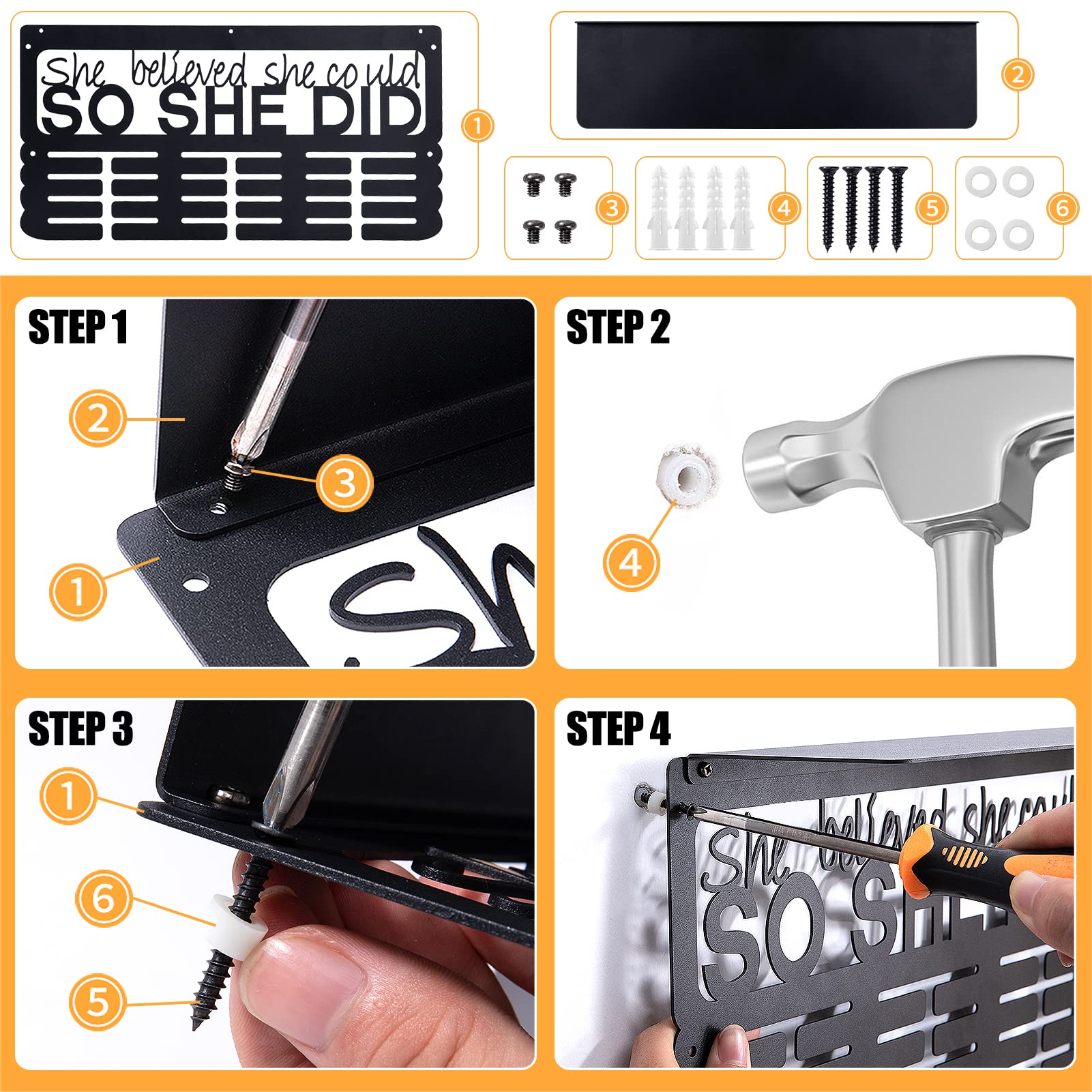 - Easy to Install: Firstly connect the medal display rack and trophy tray with short screws, then punch holes on the wall according to the holes on both sides of the rack, and finally screw in expansion screws, nylon spacers and metal screws to complete. Note: The nylon spacer on the back help separate the medal hanger from the wall for better access to medals; reducing friction while also protecting the wall.