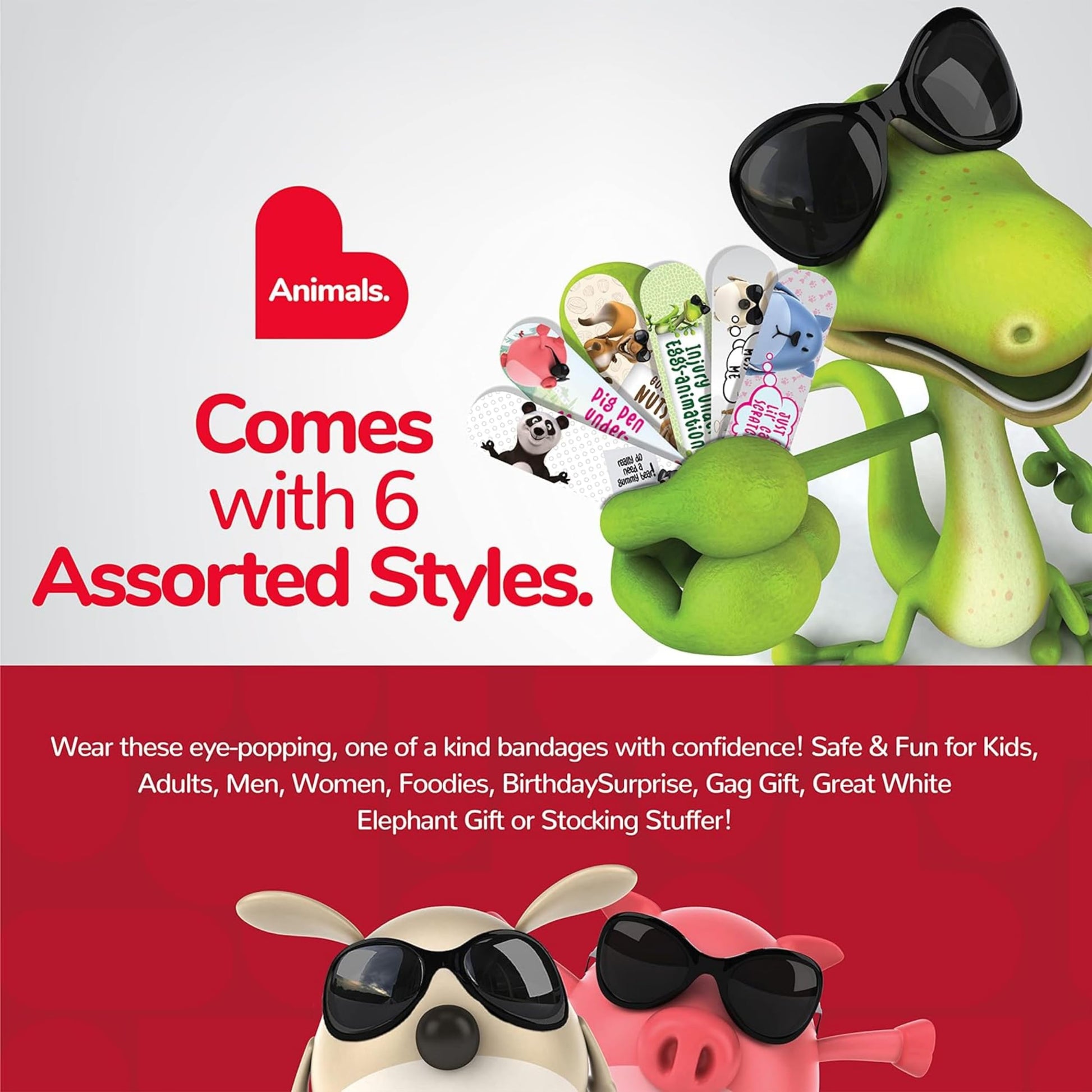 Details: They say laughter is the best medicine, and these fun assorted animals novelty bandages are a great way to put big smiles on the faces of both little boys, girls, and even adults while treating their boo boos. These skin bandages aid in the treatment of a variety of different wounds, whether it be for a minor cut, burn, scrape, shot injection, blister, and much more. These flex bandages feature absorbent, non stick cushion pads which aids in protecting the injury without sticking to the wound, wrapping comfortably on your arm, leg, face, knee, or even to wrap around your finger tip, and much more. This self adhering bandage pack contains 100 assorted animals bandage strips in 6 assorted styles, and are individually wrapped for safe handling, making these childrens bandages great for travel, home first aid kits, school nurses, and pediatric medical practitioners. Our cute and funny junior bandages are composed of sterile, latex free, breathable, and flexible fabric material for reliable long-lasting quality. These boy and girl animals shaped bandages are perfect for schools and playgrounds, and also make for a cute stocking stuffer, fun Easter basket present, or even as a funny white elephant gift. Our bandaging supplies are an excellent way to put your child, toddler, or baby at ease, even with a booboo. BioSwiss animal shaped bandages are offered in dinosaur, monkey, llama, hip hop animals, panda, bulldog, baby dino, wild safari animals, flamingo, weiner dog, sloth, penguin puppy and animal print styles.
