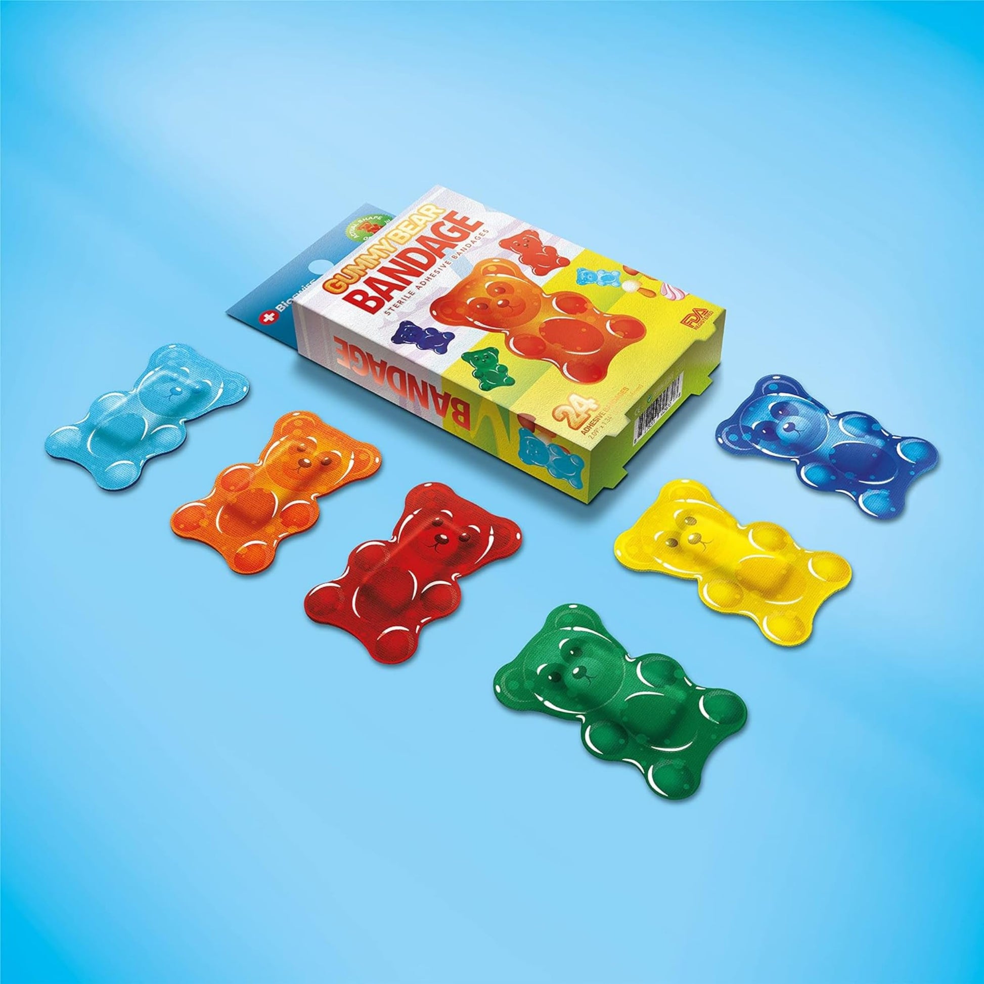 - GUMMY BEAR BANDAGES: This 24 piece pack of adorable and delicious looking gummy bear bandages is great for putting a smile on kids' faces while protecting wounds such as cuts, scrapes, and burns, and come in 3 assorted colors; sticky bandages are perfect for kids and adults alike, and also for school nurses and pediatric doctors